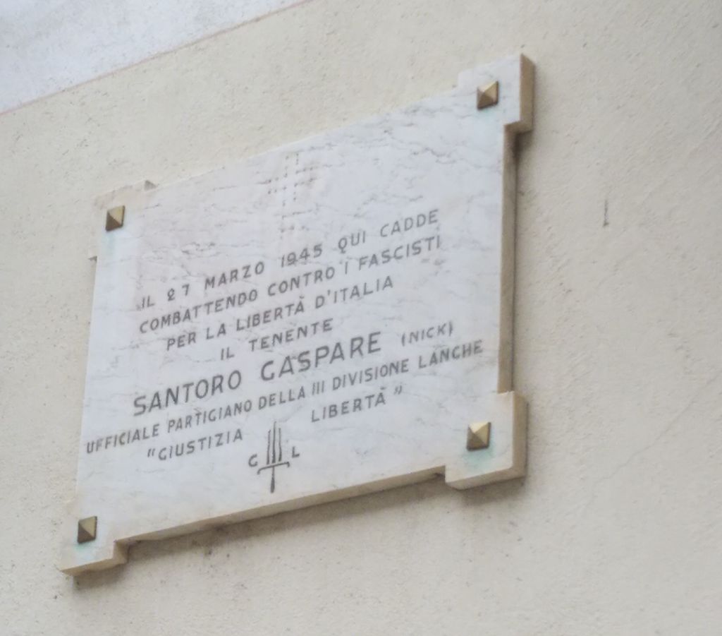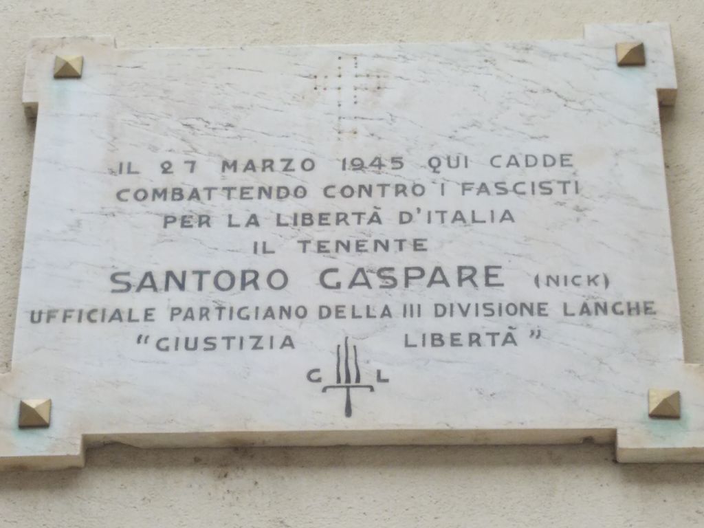 - Gaspare Santoro nasce ad Alcamo il 19 luglio 1920. Sin da bambino dimostra uno spiccato interesse per gli studi, tanto da riuscire a ottenere la licenza elementare già a otto anni. Dopo aver superato brillantemente gli studi liceali, è chiamato a svolgere il servizio militare nei Carabinieri e, laureatosi nel frattempo in Giurisprudenza, è nominato tenente e inviato nel marzo 1943 ad Atene, dove viene a contatto con la dura realtà della guerra. Durante i combattimenti che precedono l’armistizio, è catturato insieme ad altri compagni dai combattenti per la libertà greca e, costretto a scavarsi la fossa, è fortunosamente salvato da un altro reparto di Carabinieri proprio al momento dell’esecuzione. Nella concitazione causata dall’armistizio, Santoro è fra i primi a compiere atti di guerriglia contro gli ex alleati tedeschi, fino a che è catturato e deportato prima in Polonia e poi in Germania. Costretto ai lavori forzati, riesce a rientrare in Italia nella primavera del 1944 con la determinazione di continuare a servire il Re, a cui si considera legato dal suo giuramento di Carabiniere. È così che nell’ottobre del 1944 si unisce ai partigiani della 1ª divisione alpina Gl, e poi della 3ª divisione Gl Langhe, con il nome di battaglia "Nik". Divenuto comandante di battaglione, si distingue non solo per le sue capacità militari, ma anche per la sua sensibilità e umanità. Il 27 marzo 1945, in seguito a delazione, viene fucilato dai fascisti a Bene Vagienna, dove una lapide lo ricorda ancora oggi. Per i suoi meriti è stato insignito della medaglia di bronzo al valor militare.