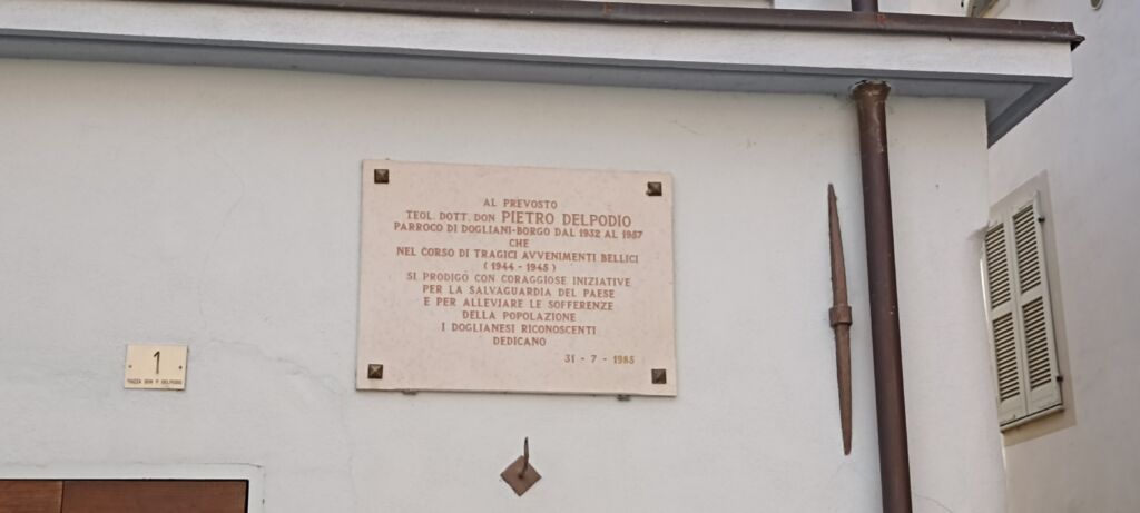 La lastra ricorda le coraggiose iniziative del parroco durante gli avvenimenti degli anni 1944/1945.