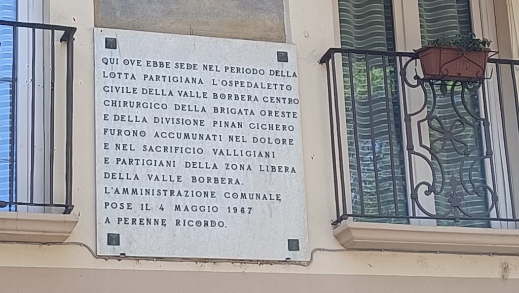 La lastra, posizionata sulla facciata dell’edificio che ospitava, durante la lotta partigiana, l’ospedale civile, ricorda il sacrificio ed il dolore dei valligiani e dei Partigiani della Valle Borbera.