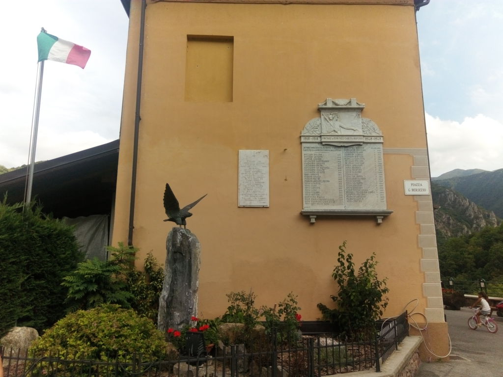 facciata di un edificio accanto alla lapide in ricordo dei caduti delle due guerre