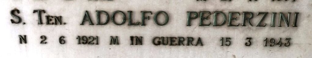Iscrizione posta nella cappella di famiglia del cimitero comunale per ricordare il sottotenente Adolfo Pederzini caduto in Russia durante la seconda guerra mondiale.