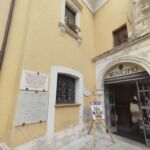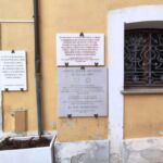 - Lastra in marmo bianco con iscrizione incisa e colorata.