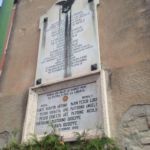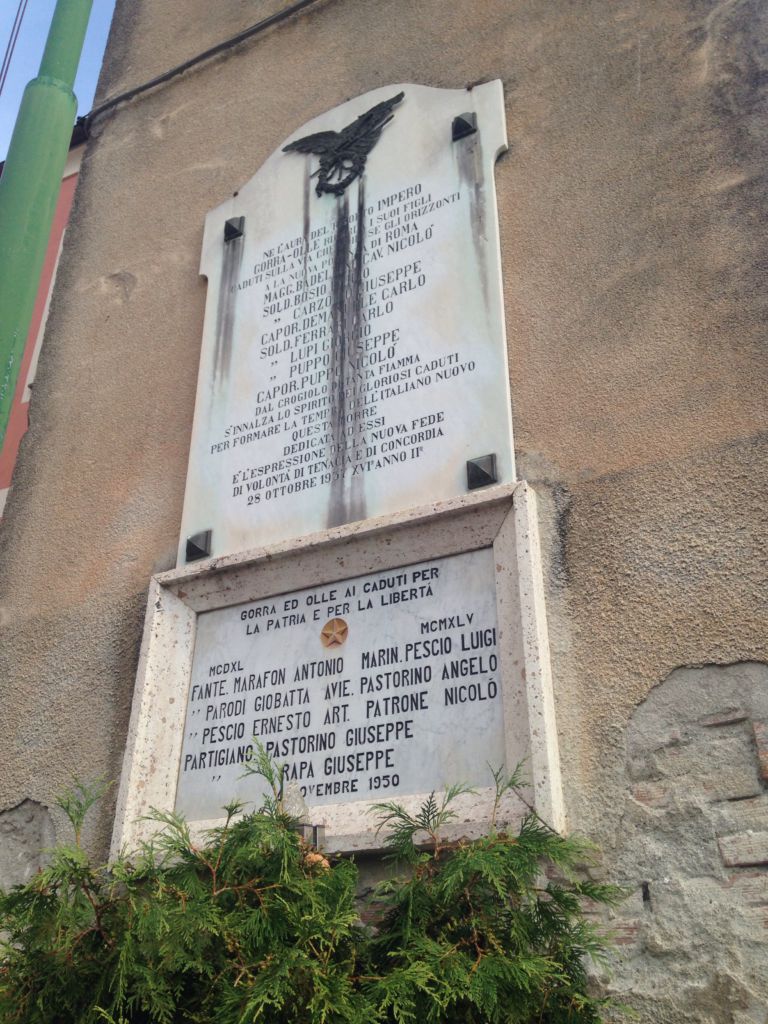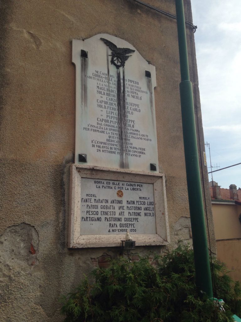 Lastra rettangolare con cornice. che reca in alto al centro una stella. E’ presente un errore nella data in numero romano (MCDXL ANZICHÈ MCMXL). La lastra è collocata sotto un’altra lastra probabilmente dedicata ai Caduti della guerra d’Abissinia.