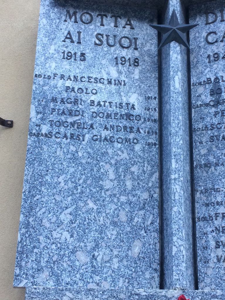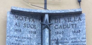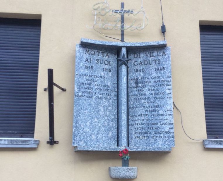La lastra di destra riporta i nomi dei Caduti della seconda guerra mondiale, mentre quella di sinistra i nomi dei Caduti del primo conflitto. La frazione di Motta ha voluto ricordarli collocando la lapide sulla facciata dell’edificio della ex scuola elementare, ben visibile dalla strada principale.