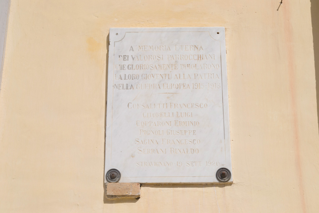 - Non sono presenti simboli ma due soli supporti bronzei e una cornice lineare disegnata attorno alle iscrizioni. A fianco della lastra trova spazio una seconda a ricordo di quanti tornarono dal conflitto.