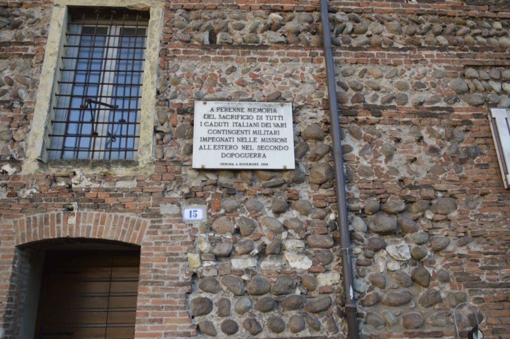 Lastra a ricordo dei Caduti italiani dei vari contingenti militari che hanno perso la vita nelle missioni all’estero. La pietra, seppure posta a ricordo di militari che hanno perso la vita nel secondo dopoguerra, è stata censita per completezza dell’area dedicata ai Caduti nella città di Verona, in piazza Bra, dove sono state affisse altre lastre e lapidi le cui schede di censimento sono disponibili in questo sito (clicca qua per trovarle).