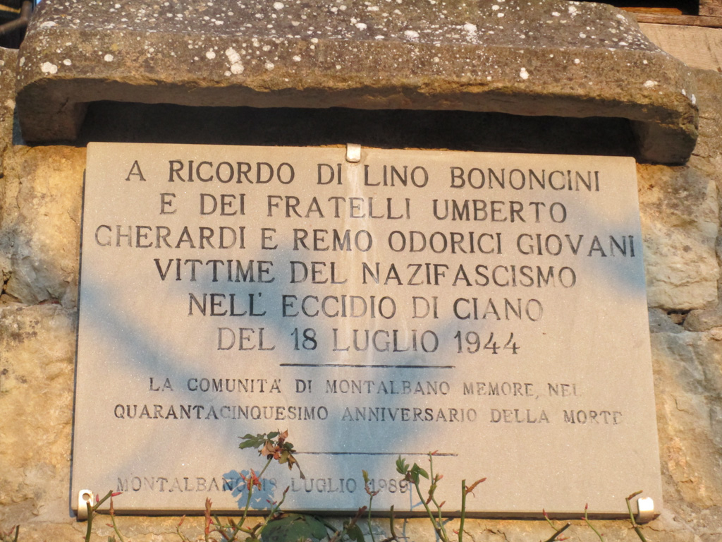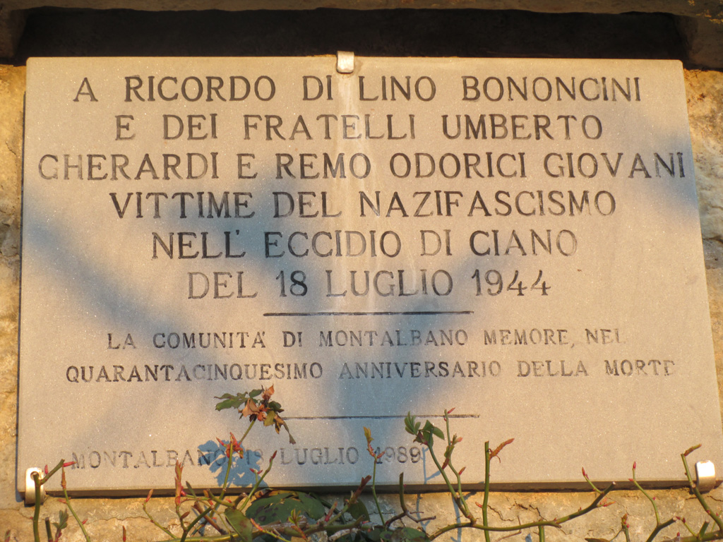 - A RICORDO DI LINO BONONCINI E DEI FRATELLI UMBERTO GHERARDI E REMO ODORICI GIOVANI VITTIME DEL NAZIFASCISMO NELL'ECCIDIO DI CIANO DEL 18 LUGLIO 1944