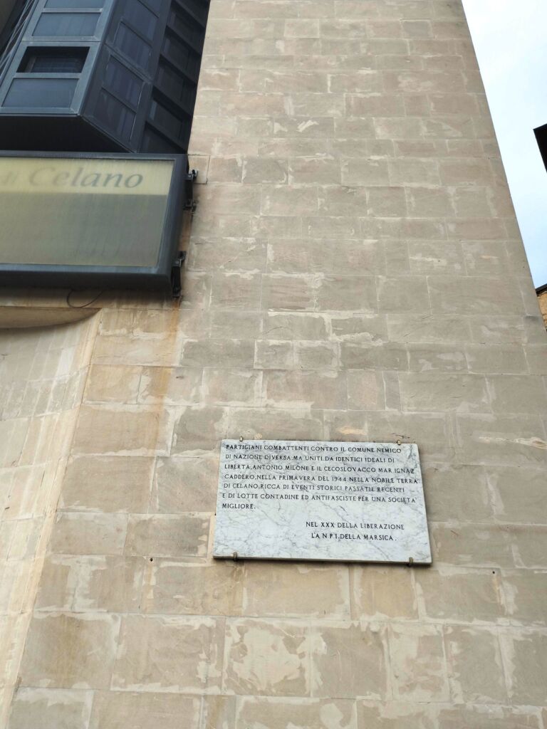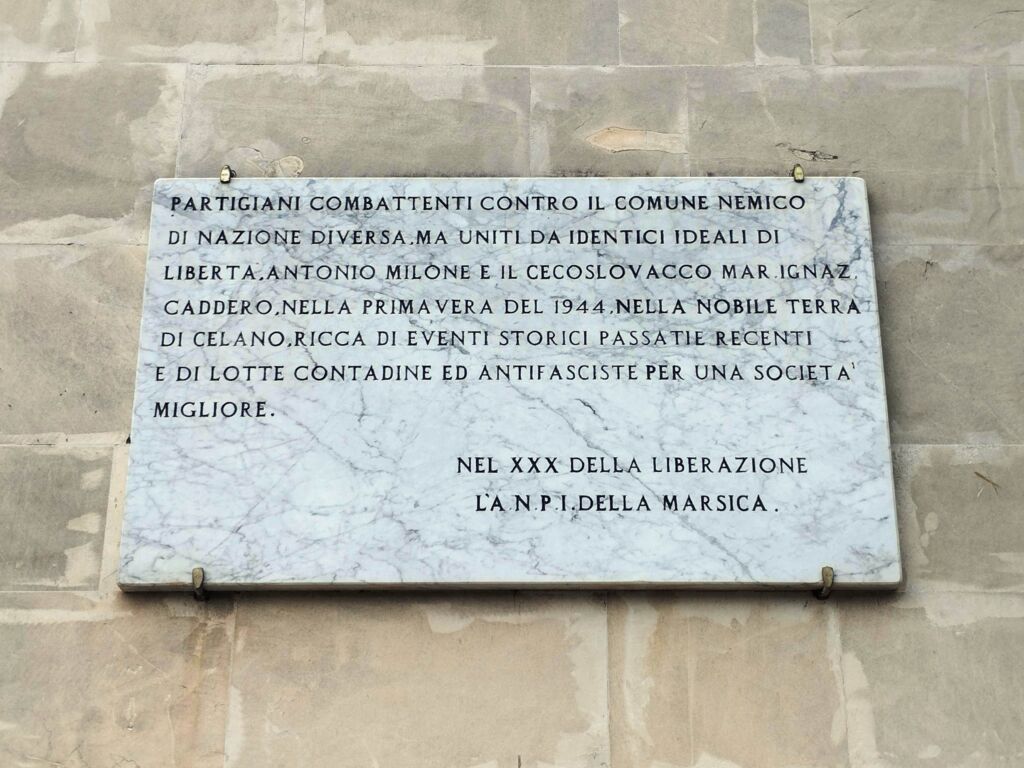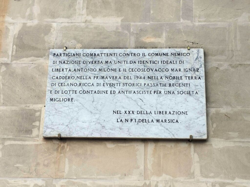 Nel 1975, in ricorrenza del XXX anniversario della Liberazione, la lastra fu posta sulla facciata del municipio dall’ANPI della Marsica. Anni dopo la lastra fu trasferita nell’atrio del comune, dove non era più ben visibile. Nell’aprile 2015, a 70 anni dalla Liberazione dell’Italia, la lastra fu riposizionata sulla facciata principale del Municipio.
