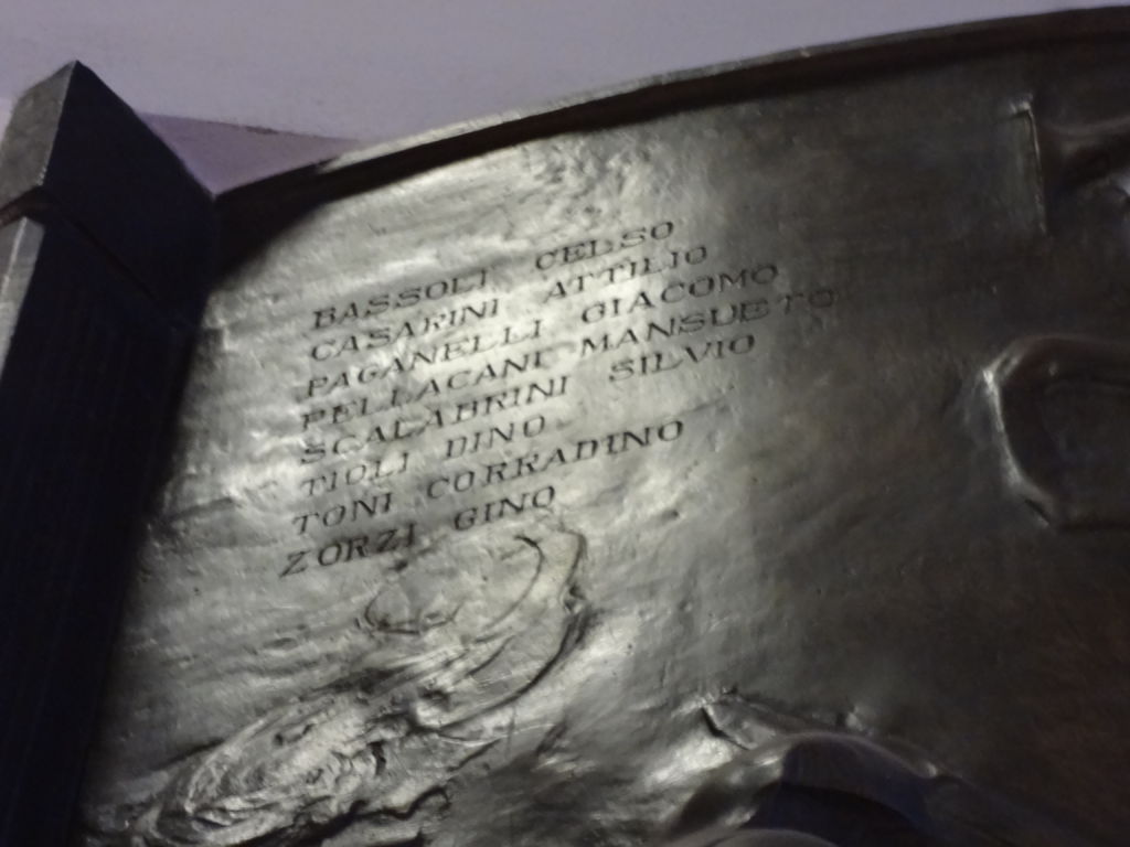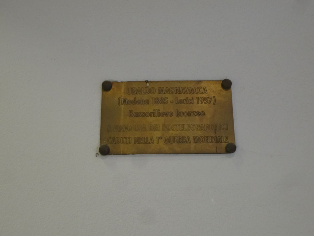- Collocata nell’atrio delle Poste Centrali di via Modonella, la lapide in bronzo a rilievo illustra uno spaccato di vita al fronte. Questa memoria è dedicata ai postelegrafonici, che ebbero un ruolo importante nello svolgimento delle azioni in quanto responsabili della trasmissione delle comunicazioni. Per la realizzazione del rilievo fu indetto un concorso vinto dal poliedrico artista modenese Ubaldo Magnavacca. Allievo dell’Accademia modenese, Magnavacca vinse premi e riconoscimenti per la sua attività di incisore, pittore e scultore, interessi che lo avvicinarono a Giuseppe Graziosi, altro scultore molto attivo nell’ambito delle commissioni per i monumenti ai Caduti, con il quale condivideva anche l’interesse per i soggetti agresti.