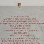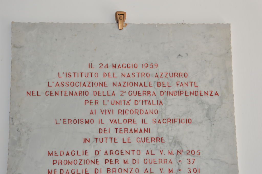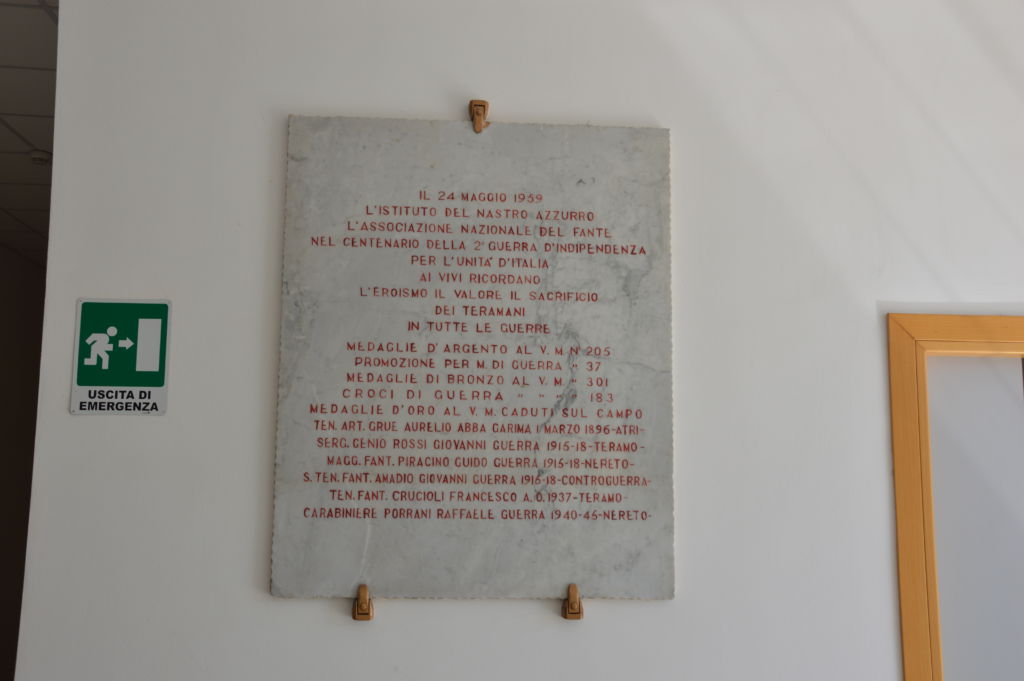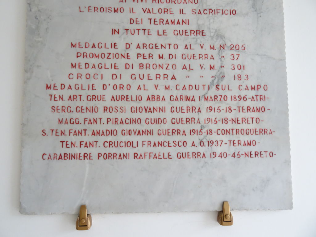La lastra è ben visibile, posizionata in un luogo di passaggio ben illuminato. Nelle pareti vicine ci sono altre Testimonianze di caduti . Questa lastra ci ricorda il numero di medaglie assegnate al valor militare e nomina alcuni caduti originari di Teramo e provincia.