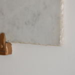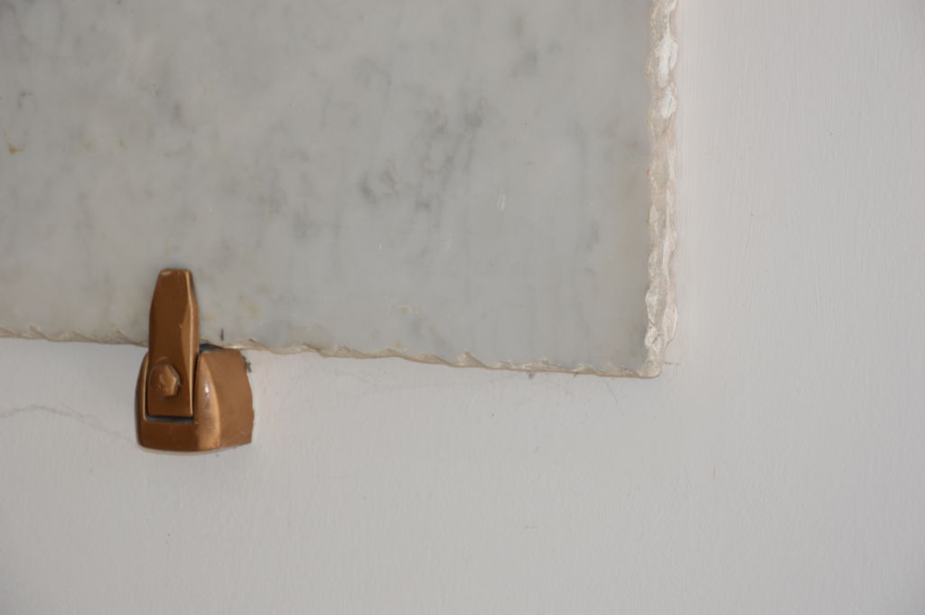 - La lastra è interamente in marmo grigio chiaro con venature grigio scuro. Sono presenti tre supporti in bronzo a forma di ganci, due nella parte inferiore , uno al centro del lato superiore. Le scritte sono incise e colorate di rosso scuro.