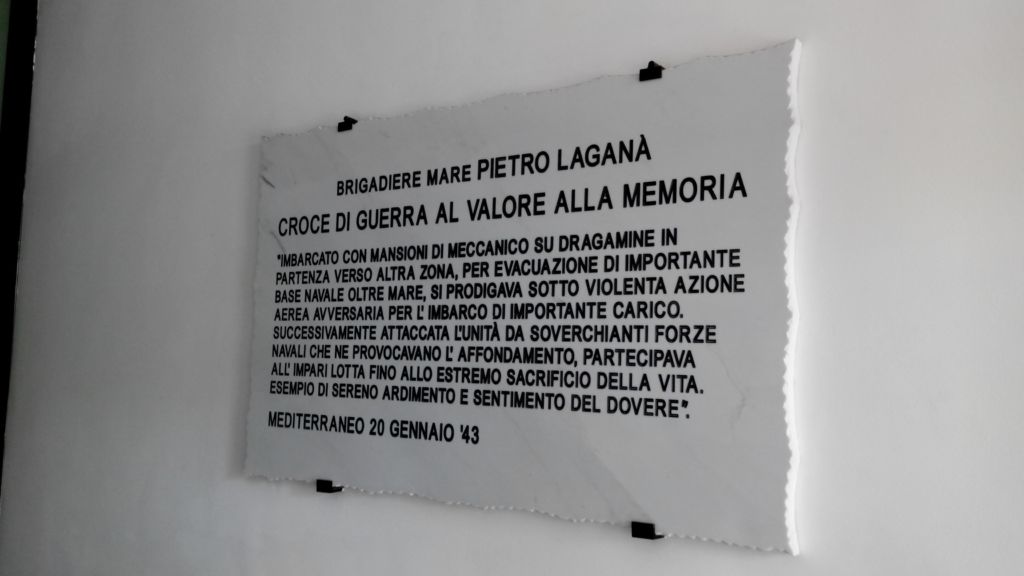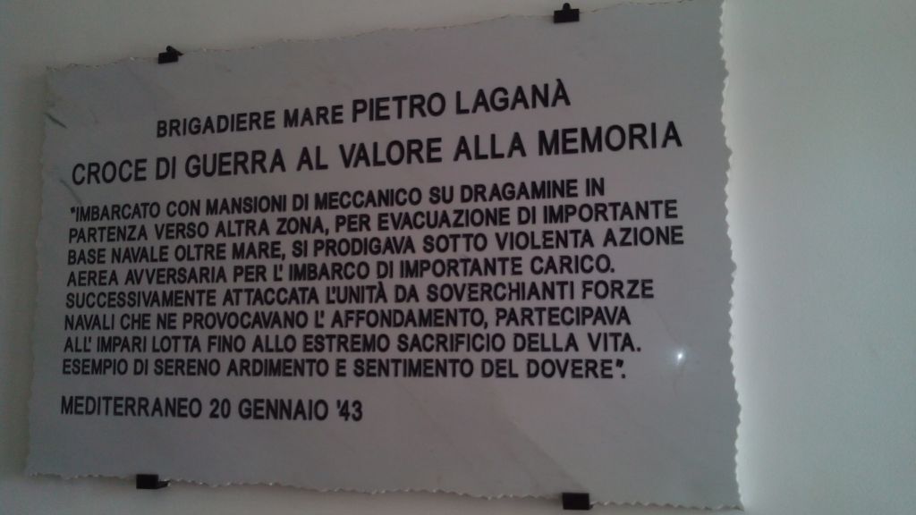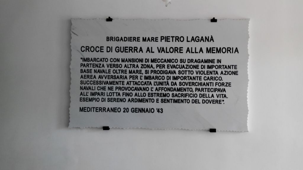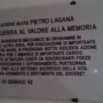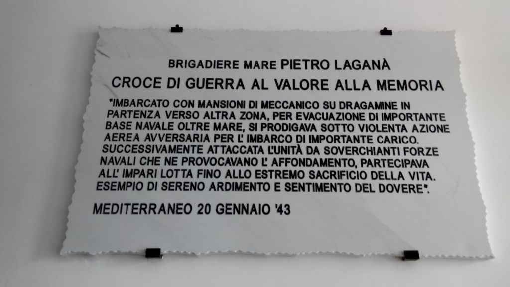 Lastra commemorativa di forma rettangolare al Brigadiere mare Pietro Laganà, decorato di Croce di Guerra al Valor Militare, caduto in Mediterraneo il 20 gennaio 1943.