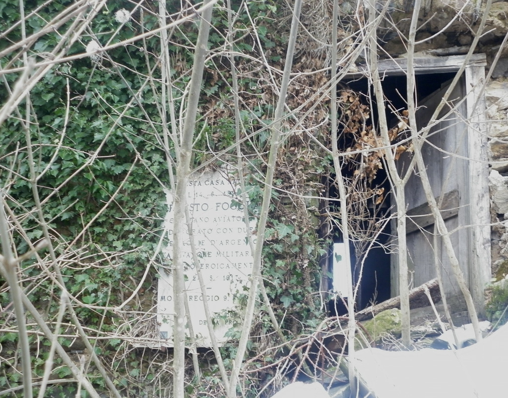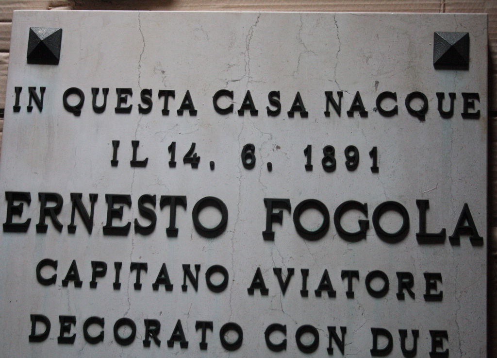 Purtroppo l'abbandono e l'incuria degli attuali proprietari, della casa natale del Capitano Aviatore Ernesto Fogola, non hanno permesso il riposizionamento della lastra nella sua posizione originaria.
