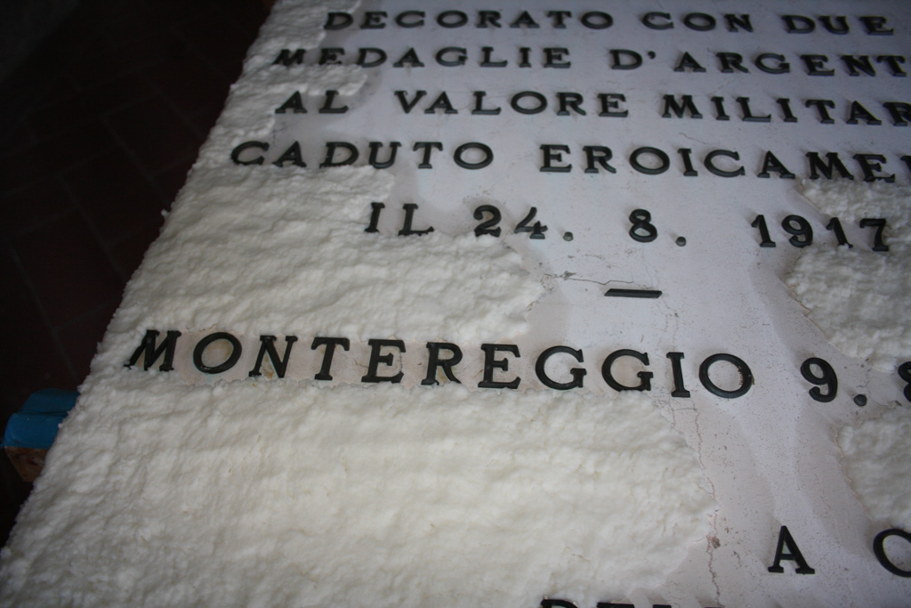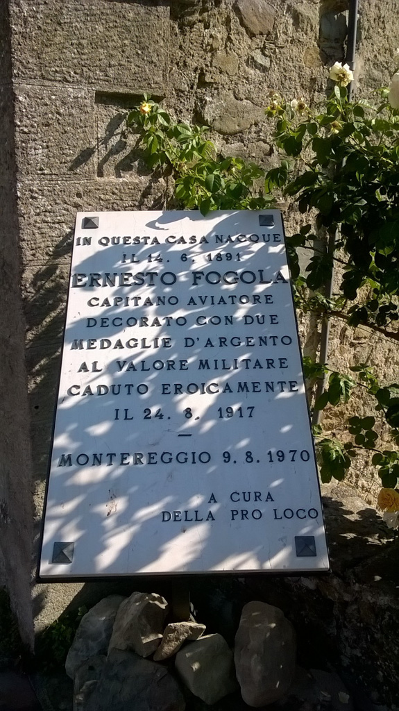 Lastra commemorativa in marmo con iscrizioni in bronzo voluta dalla Proloco di Montereggio e posata sulla casa natale del Capitano Aviatore Ernesto Fogola il 09/08/1970. Ricorda la nascita e gli atti eroici del capitano caduto nella Grande Guerra.