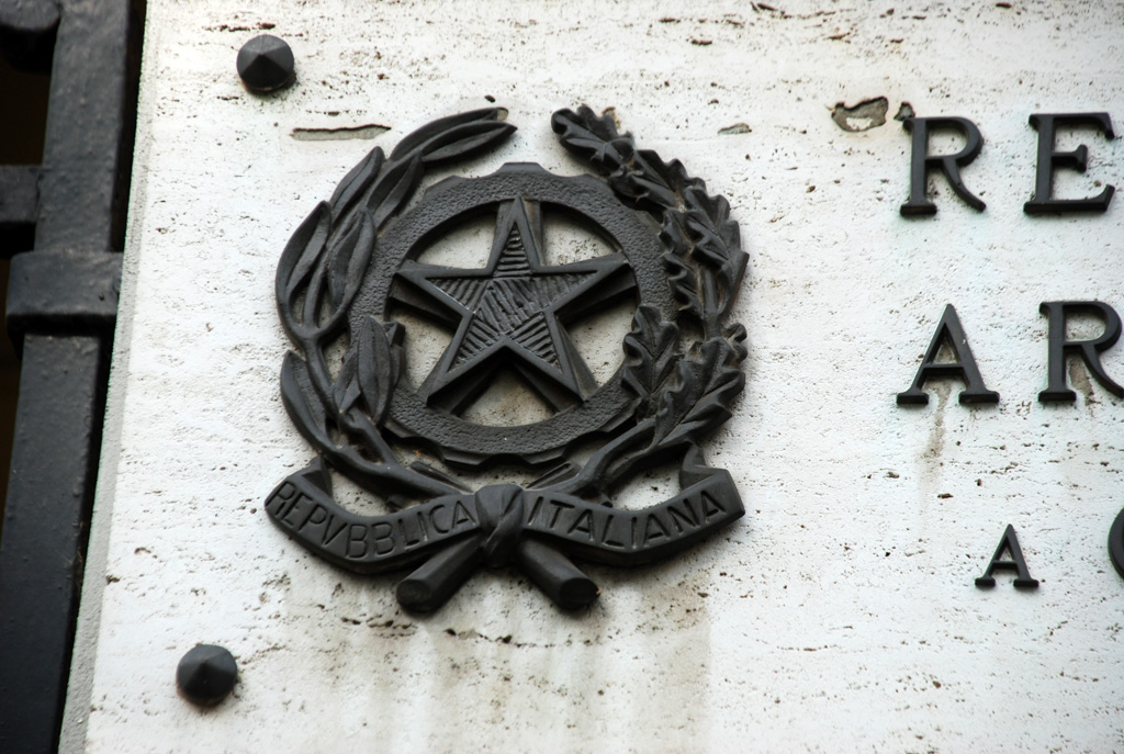 - Stemma delle Repubblica Italiana (foglia di ulivo, foglia di quercia incrociate con al centro una stella a 5 punte e sotto scritta Repubblica Italiana).