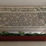 Lastra in marmo; iscrizione in bronzo; ancorata su struttura in ferro di colore rosso