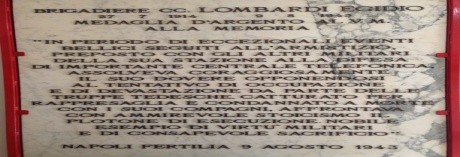 BRIGADIERE CC LOMBARDI EGIDIO / 27-07-1914 09-08-1943 / MEDAGLIA D'ARGENTO AL V.M. ALLA MEMMORIA / "IN PERIODI DI ECCEZIONALI EVENTI / BELLICI SEGUITI ALL’ARMISTIZIO / PREPOSTO CON GLI ALTRI MILITARI / DELLA SUA STAZIONE ALLA DIFESA / DI IMPORTANTE CENTRALE TELEFONICA, / ASSOLVEVA CORAGGIOSAMENTE / IL SUO DOVERE OPPONENDOSI / AL TENTATIVO DI OCCUPAZIONE E DI / DEVASTAZIONE DA PARTE DELLE / TRUPPE TEDESCHE. CATTURATO PER / RAPPRESAGLIA E CONDANNATO A MORTE / CON I SUOI COMPAGNIA, AFFRONTAVA / CON AMMIREVOLE STOICISMO IL / PLOTONE DI ESECUZIONE. NOBILE / ESEMPIO DI VIRTÙ MILITARI / E DI CONSAPEVOLE SACRIFICIO. / NAPOLI FERTILIA 9 AGOSTO 1943
