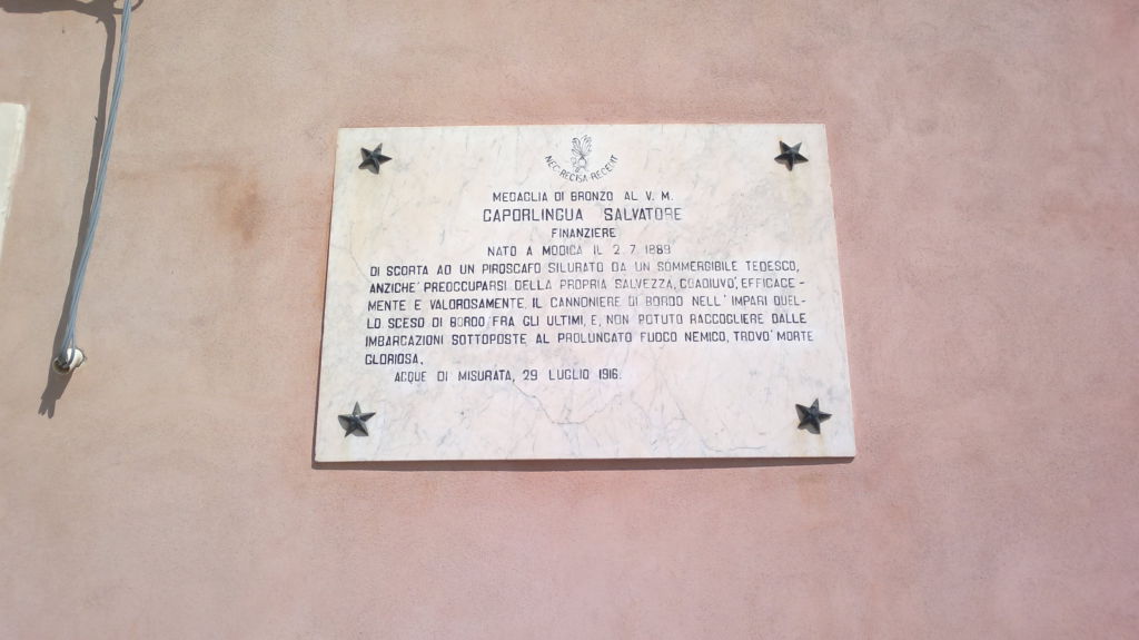 La lastra commemora il Finanziere Salvatore Caporlingua, caduto nel corso della prima guerra mondiale: il piroscafo "Letimbro" su cui era imbarcato fu affondato da un sommergibile tedesco nelle acque di Misurata (Liibia - 29 luglio 1916).