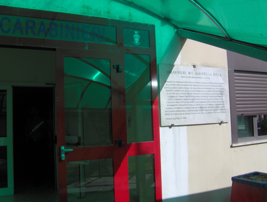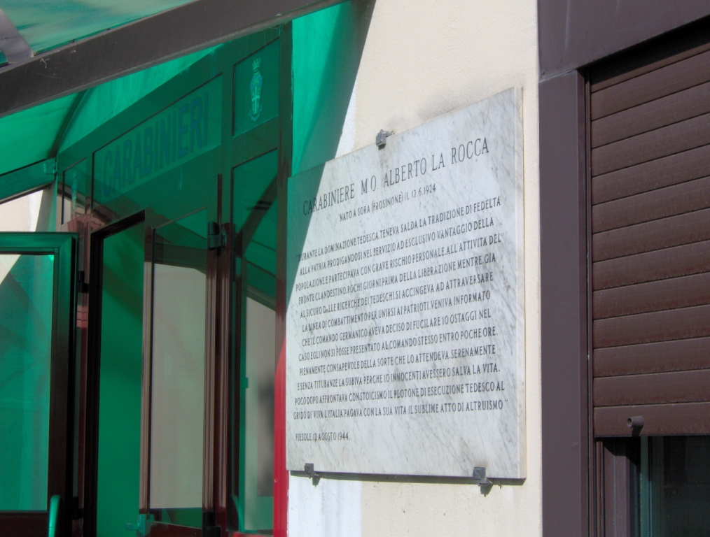 - CARABINIERE M.O. ALBERTO LA ROCCA / NATO A SORA (FROSINONE) IL 12.06.1924 / “DURANTE LA DOMINAZIONE TEDESCA TENEVA SALDA LA TRADIZIONE DI FEDELTA’ / ALLA PATRIA PRODIGANDOSI NEL SERVIZIO AD ESCLUSIVO VANTAGGIO DELLA / POPOLAZIONE E PARTECIPAVA CON GRANDE RISCHIO PERSONALE ALL’ATTIVITA’ DEL / FRONTE CLANDESTINO. POCHI GIORNI PRIMA DELLA LIBERAZIONE MENTRE GIA’ / AL SICURO DALLE RICERCHE DEI TEDESCHI SI ACCINGEVA AD ATTRAVERSARE / LA LINEA DI COMBATTIMENTO PER UNIRSI AI PATRIOTI, VENIVA INFORMATO / CHE IL COMANDO GERMANICO AVEVA DECISO DI FUCILARE 10 OSTAGGI NEL / CASO EGLI NON SI FOSSE PRESENTATO AL COMANDO STESSO ENTRO POCHE ORE. / PIENAMENTE CONSAPEVOLE DELLA SORTE CHE LO ATTENDEVA, SERENAMENTE E / SENZA TITUBANZE LA SUBIVA PERCHE’ 10 INNOCENTI AVESSERO SALVA LA VITA. / POCO DOPO AFFRONTAVA CON STOICISMO IL PLOTONE DI ESECUZIONE TEDESCO AL / GRIDO DI “VIVA L’ITALIA” PAGAVA CON LA SUA VITA IL SUBLIME ATTO DI ALTRUISMO” / FIESOLE, 12 AGOSTO 1944.