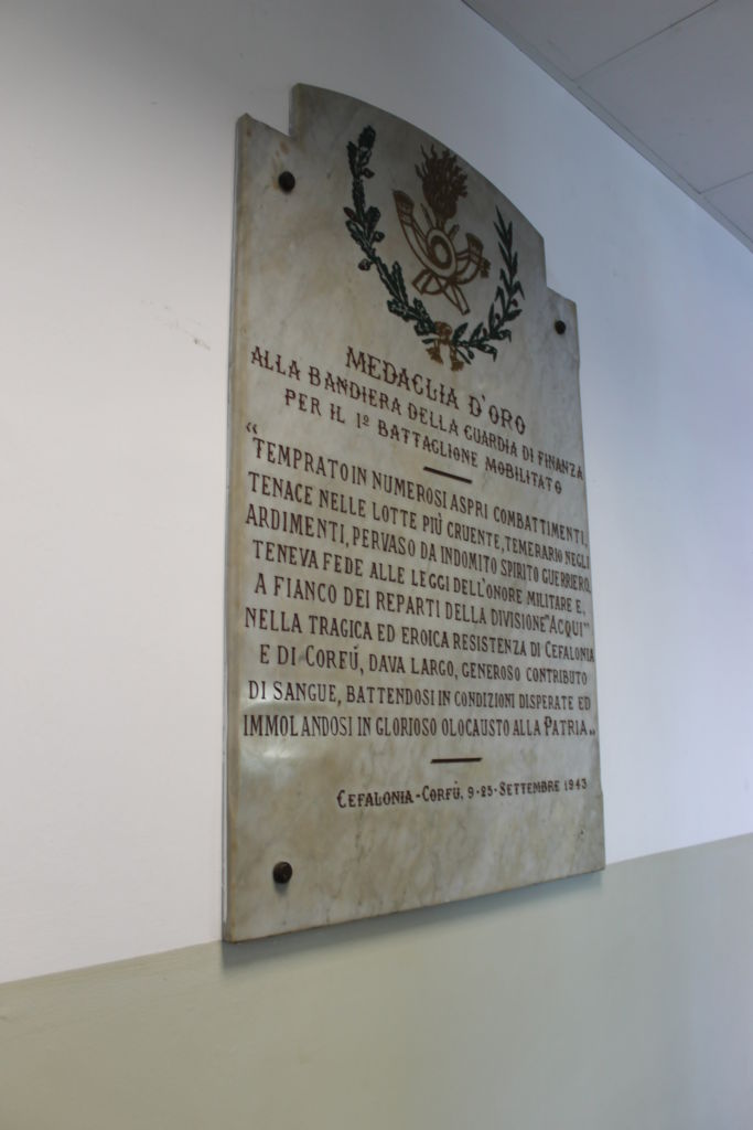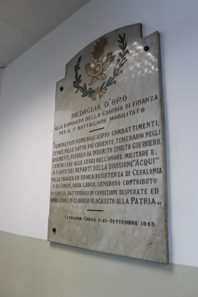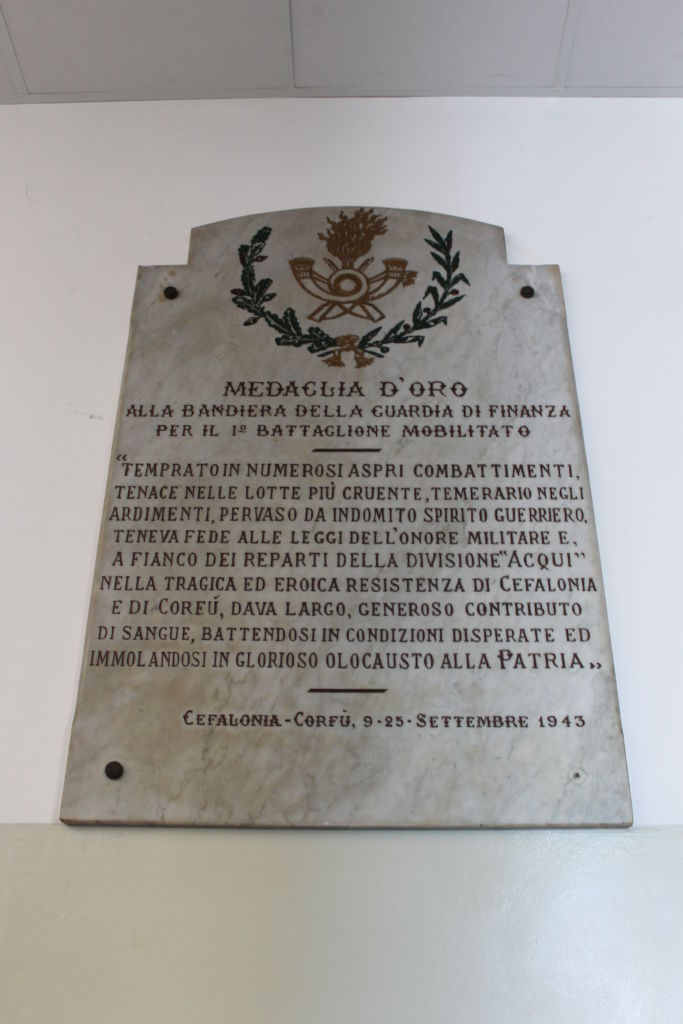 - La Pietra è stata dedicata alla Bandiera della Guardia di Finanza, per il I° Battaglione che, negli scontri avvenuti a Cefalonie Corfù, ha dato generoso contributo di sangue battendosi in condizioni disperate.