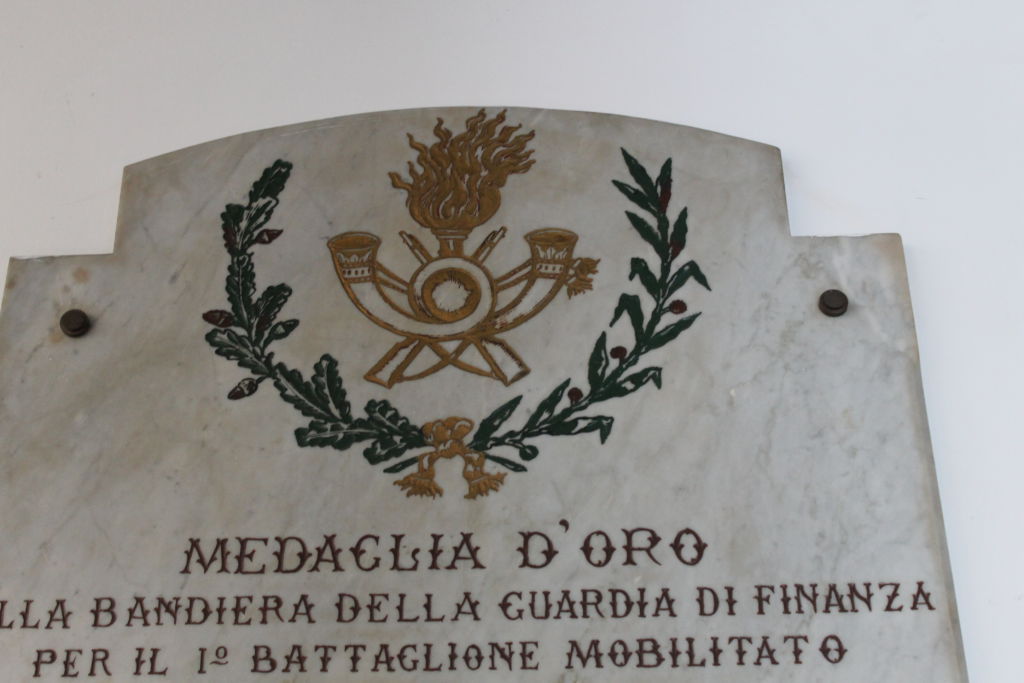 - Lastra in marmo bianco di Carrara con scritte incise a colore di vernice marrone/bronzo e disegni color verde dei rami e giallo oro del nastro e delleffige della Guardia di Finanza; sospensori a muro a rilievo in bronzo