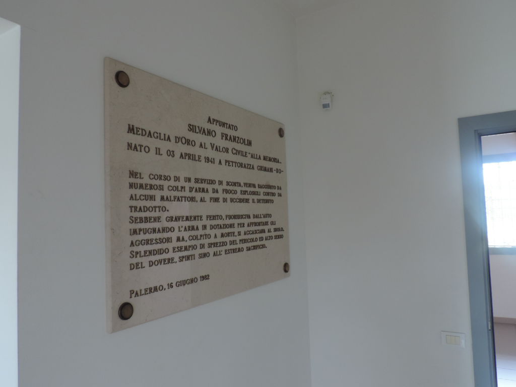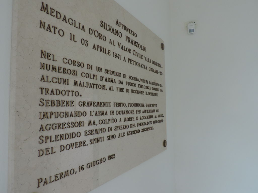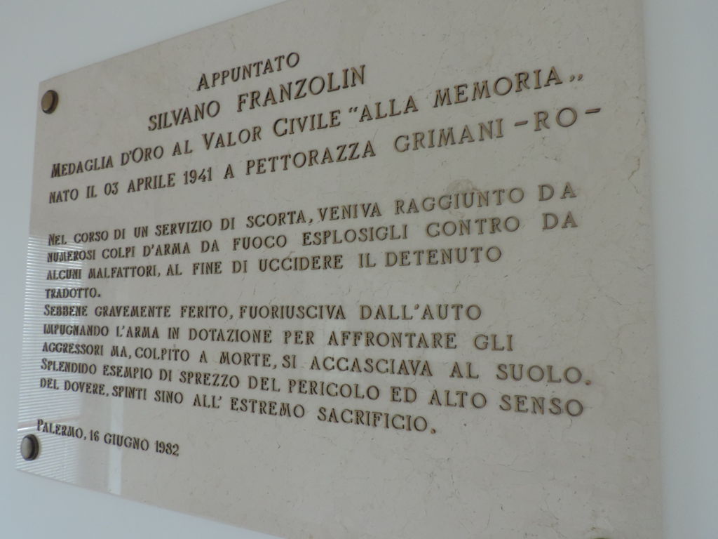 - APPUNTATO / SILVANO FRANZOLIN / MEDAGLIA D'ORO AL VALOR CIVILE "ALLA MEMORIA" / NATO IL 03 APRILE 1941 A PETTORAZZA GRIMANI -RO- / NEL CORSO DI UN SERVIZIO DI SCORTA, VENIVA RAGGIUNTO DA / NUMEROSI COLPI D'ARMA DA FUOCO ESPLOSI CONTRO DA / ALCUNI MALFATTORI, AL FINE DI UCCIDERE IL DETENUTO / TRADOTTO. / SEBBENE GRAVEMENTE FERITO, FUORIUSCIVA DALL'AUTO / IMPUGNANDO L'ARMA IN DOTAZIONE PER AFFRONTARE GLI / AGGRESSORI MA, COLPITO A MORTE, SI ACCASCIAVA AL SUOLO. / SPLENDIDO ESEMPIO DI SPREZZO DEL PERICOLO ED ALTO SENSO / DEL DOVERE, SPINTI SINO ALL'ESTREMO SACRIFICIO. / PALERMO, 16 GIUGNO 1982