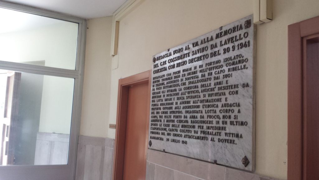 - MEDAGLIA D'ORO AL V.M. ALLA MEMORIA / DEL C.RE COSSIDENTE SAVINO DA LAVELLO / CONCESSA CON REGIO DECRETO DEL 20 9 1941 / DISTACCATO CON POCHI UOMINI IN UN FORTINO ISOLATO, / MENTRE TROVAVASI SOLO ED INERME NELL’UFFICIO COMANDO / DI STAZIONE, AGGREDITO DI SORPRESA DA UN CAPO RIBELLE, / DA POCO SOTTOMESSOSI, CHE SPALLEGGIATO DAI SUOI / GREGARI GLI INTIMAVA LA CONSEGNA DELLE ARMI E / MUNIZIONI IN DOTAZIONE ALL’UFFICIO, ANZIZHE’ DESISTERE DA UNA LOTTA IMPARI E SENZA SPERANZA SI RIFIUTAVA CON / FERREA RISOLUZIONE DI ADERIRE ALL’INTIMAZIONE E / PREFERIVA OPPORRE AGLI AGGRESSORI L’EROICA AUDACIA / DEL SUO CUORE INTREPIDO. INGAGGIATA LOTTA CORPO A / CORPO, TRE VOLTE FERITO DA ARMA DA FUOCO, NON SI / ARRENDEVA E MENTRE CERCAVA RAGGIUNGERE IN UN ULTIMO / SFORZO LE CASSE DELLE MUNIZIONI PER IMPEDIRNE / L’ASPORTAZIONE, CADEVA COLPITO DA PUGNALATE VITTIMA / PURISSIMA DEL SUO EROICO ATTACCAMENTO AL DOVERE. / MARMARCHIA 20 LUGLIO 1941