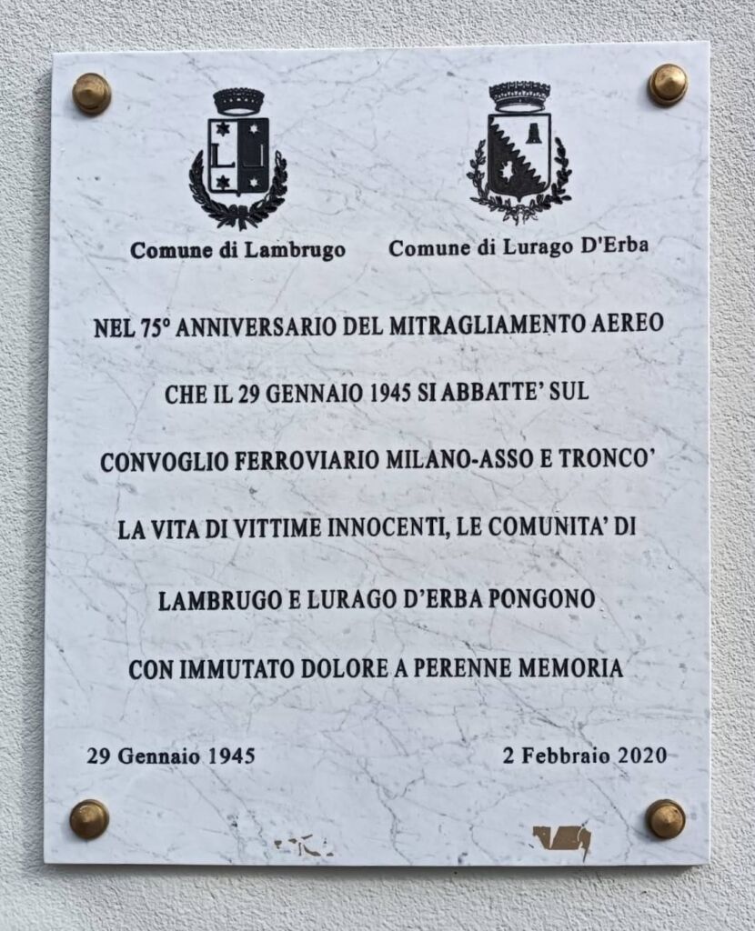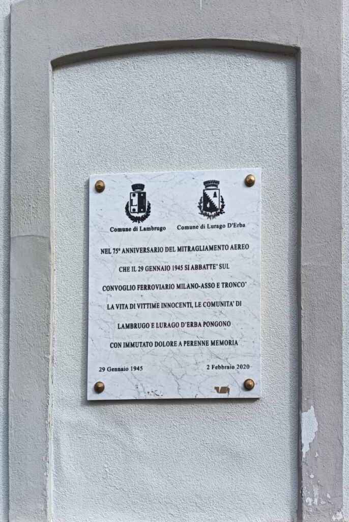 - Durante la ritirata tedesca dei primi mesi del 1945, le incursioni aeree alleate sull’area erbese-comasca furono numerose, poiché la zona ospitava distaccamenti tedeschi ancora operativi. L'evento a cui fa riferimento la lapide è il mitragliamento aereo del treno della linea Milano-Asso, avvenuto il tardo pomeriggio del 29 gennaio 1945, durante le fasi finali della seconda guerra mondiale. Il convoglio, un treno pendolare carico di civili e sfollati (quindi non un treno militare), fu attaccato da un aereo alleato (spesso identificato come un "caccia bombardiere") nel tratto che va da Cascina Maria di Lurago al ponte sulla statale Como-Bergamo. Il convoglio si fermò immediatamente con la motrice riparata sotto il ponte, mentre tutti i passeggeri che erano rimasti illesi, in preda alla paura, fuggirono in cerca di un rifugio per i campi innevati. Questo tipo di attacchi, diretti a convogli ferroviari per disarticolare le vie di comunicazione e la logistica dell'occupante nazifascista, purtroppo causò in molte occasioni la morte di vittime civili. Il mitragliamento, che si abbatté sul treno con estrema violenza, causò 8 vittime civili e numerosi feriti (si parla di circa 40 feriti). L’assistenza sul posto ai morti, ai feriti e ai superstiti fu prestata dal parroco di Lambrugo, don Edoardo Arrigoni, e dagli abitanti dei casolari circostanti.