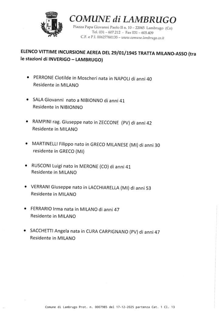 Si ringrazia l'Amministrazione del Comune di Lambrugo per aver fornito all'Autore, a scopo di pubblicazione, la lista delle otto Vittime dell'incursione aerea del 29/01/1945 sulla tratta Milano-Asso. La stessa lista fu letta durante la cerimonia commemorativa della posa della targa.