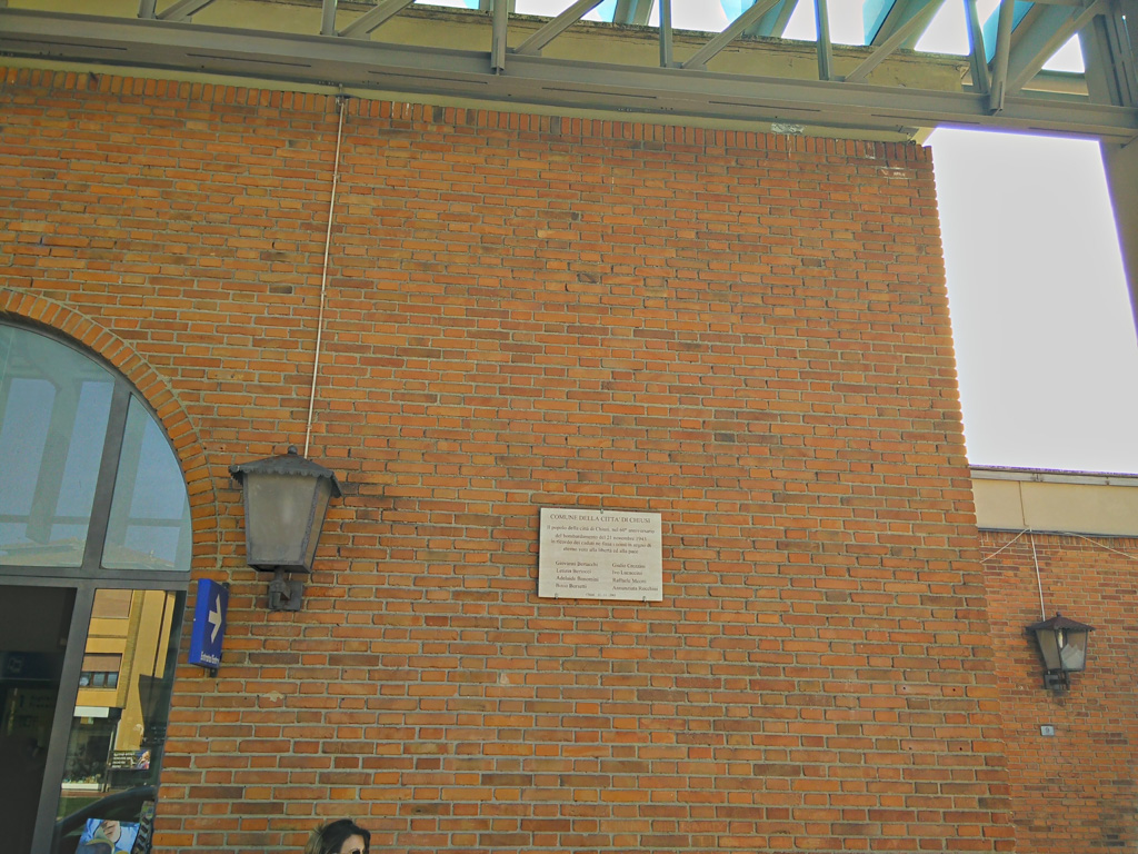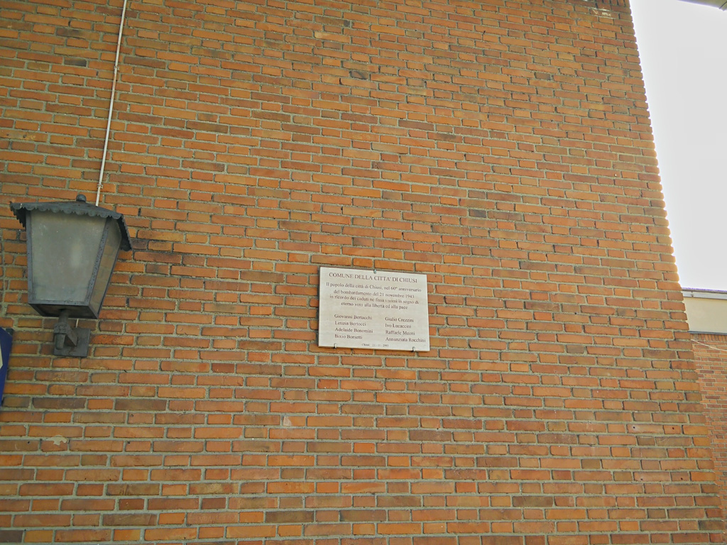 La lastra ricorda le vittime del bombardamento della stazione di Chiusi durante la seconda guerra mondiale. E’ di forma rettangolare, riporta un lista di 8 Caduti. E’ collocata in una parete esterna della stazione.