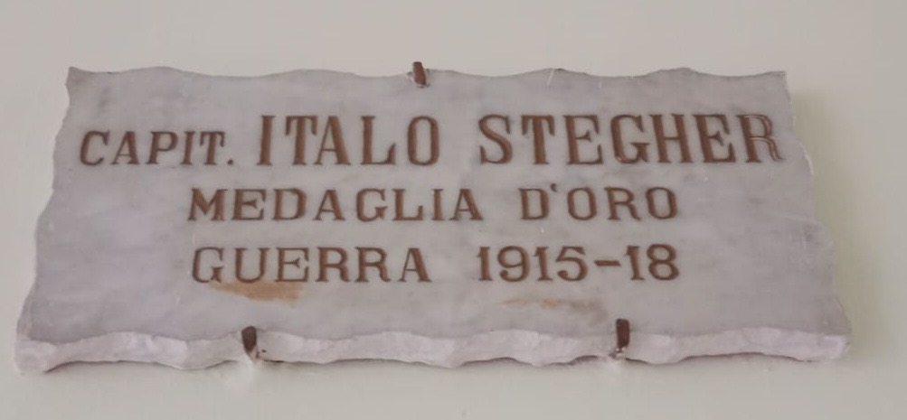 - La pietra commemora Italo Stegher, uno dei tanti giovani che si distinse per il suo coraggio e per il valore che seppe esprimere al fronte. Italo nacque il 28 Maggio 1894 a Civitavecchia. Da Loreto, in provincia di Ancona, la famiglia si trasferì poi a Forlì, dove Italo iniziò il suo percorso militare. A 23 anni è già capitano, alla guida di una compagnia della Birgata Taro. E' il prototipo di giovane borghese, acculturato, patriota, pervaso dal senso di completare l'Unità d'Italia. Circondato da austro-ungarici travestiti da italiani durante la Battaglia di Bainsizza nell'agosto del 1917, non si arrende e viene ucciso. Alla sua memoria venne conferita la medaglia d'oro al valor militare e per gli alti meriti militari conseguiti da Italo e anche per onorare la sua famiglia, Loreto, città natale di suo padre Vittorio, gli ha dedicato anche una via.