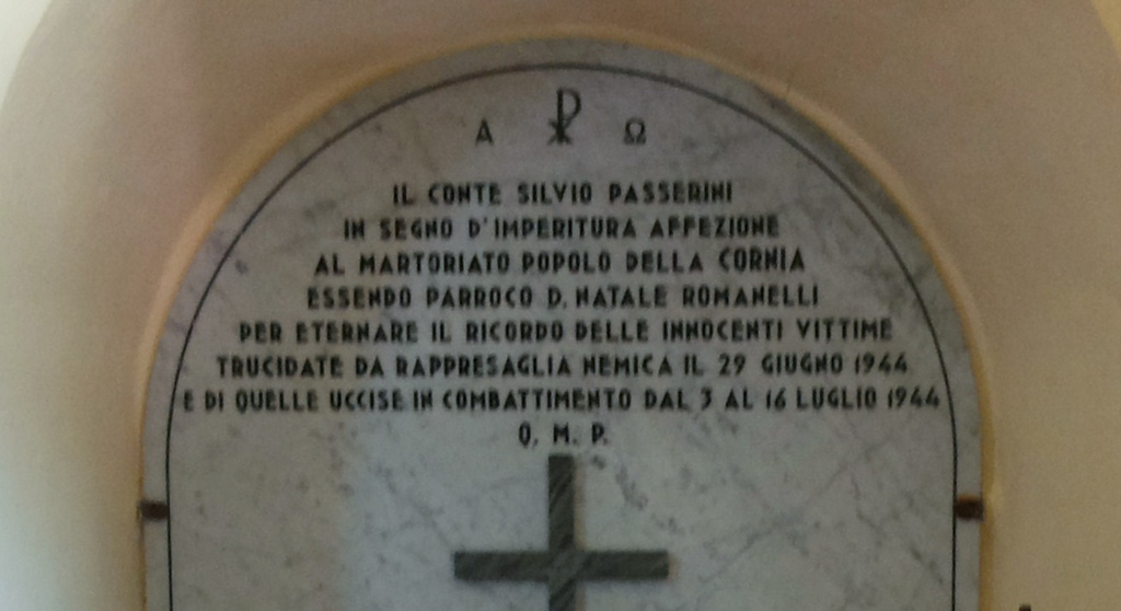 - La lastra è dedicata ai 58 Caduti che rimasero vittime delle rappresaglie dell'esercito tedesco, tra le frazioni di Cornia, Solaia e San Pancrazio dopo i terribili fatti che avevano sconvolto Civitella in val di chiana il 29 giugno 1944 fino all'arrivo dell'VIII armata inglese il 16 luglio dello stesso anno.