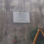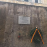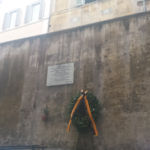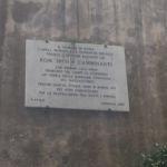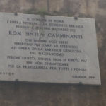 - Lastra rettangolare in marmo fissata al muro con supporti in acciaio. Le scritte incise sono di colore nero.