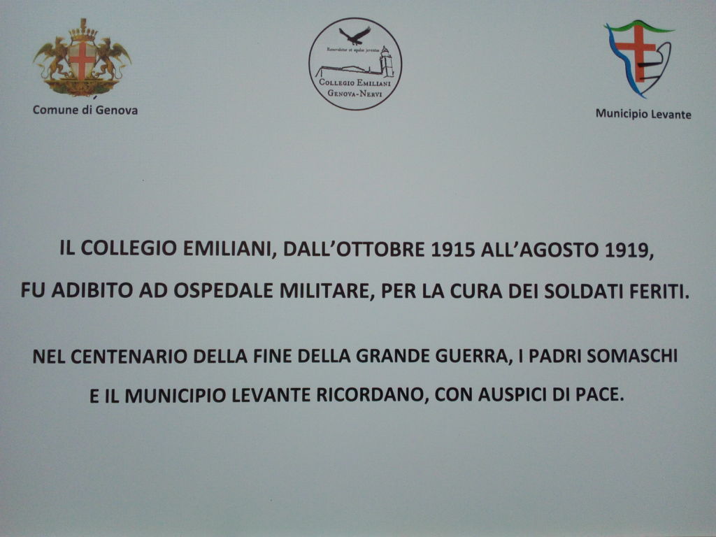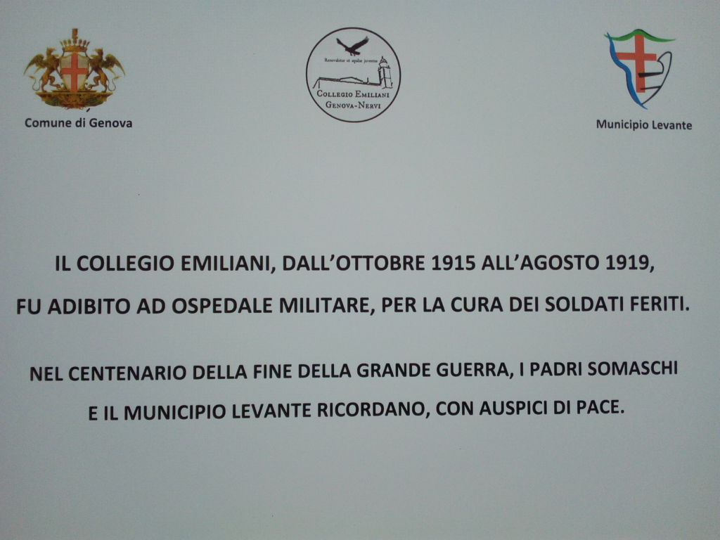 - "Dopo pochi giorni dall'entrata in guerra dell'Italia, i Padri somaschi offrono alla Croce Rossa i locali del Collegio Emiliani per ricoverare i soldati feriti e il Ministero della Guerra approva l'iniziativa. Nell'ottobre 1915 dal fronte arrivano i primi feriti e in quattro anni se ne ricoverano centinaia, la cui permanenza è ben documentata dalle cartoline indirizzate alle famiglie". Da P. RISSO M. ROSSI PATRONE, Nervi, Sant'Ilario-Quinto. Ieri e oggi, Nuova Editrice Genovese, 2013, pp. 174-175. Sono in corso studi di approfondimento.