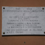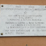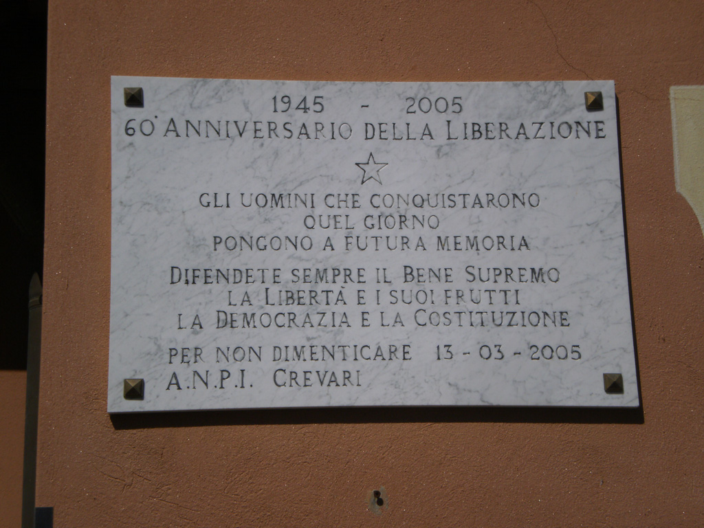 Lastra in marmo voluta dalla sezioni Anpi di Crevati (Genova) nel sessantesimo anniversario della Liberazione. Presenta iscrizioni incise e colorate in nero.