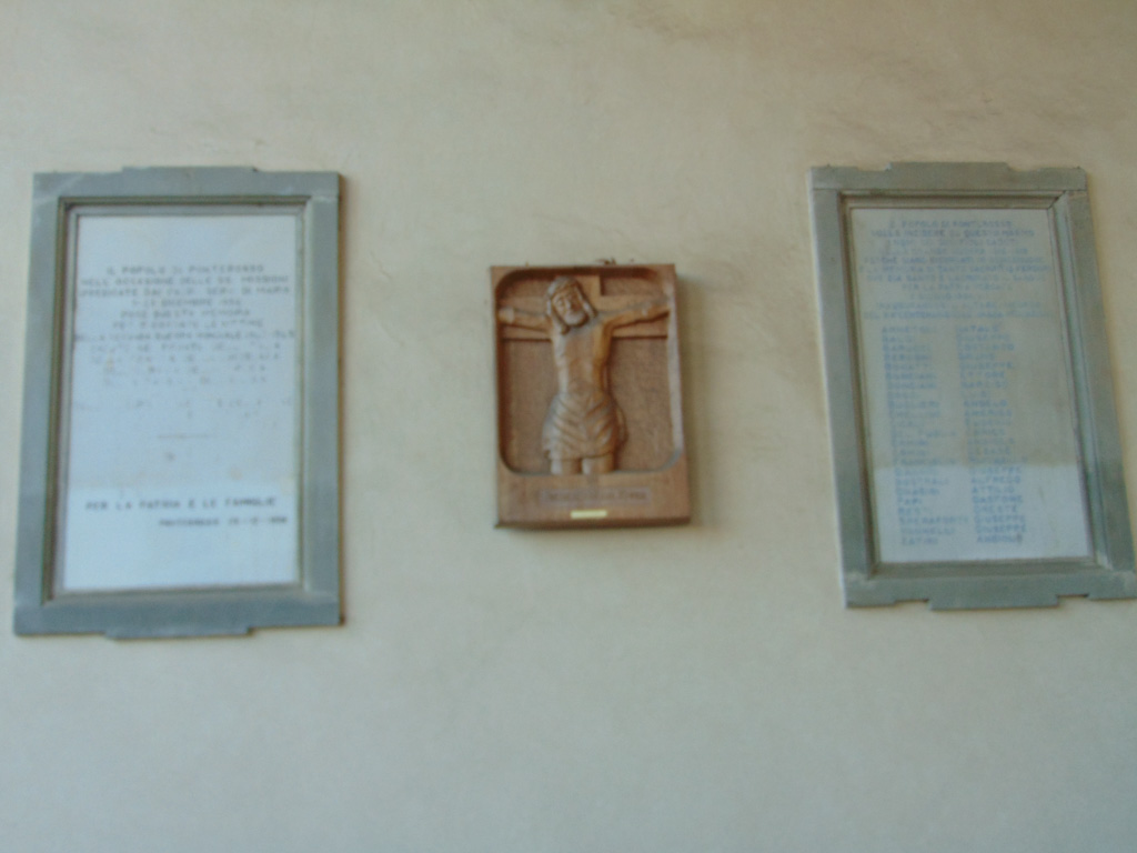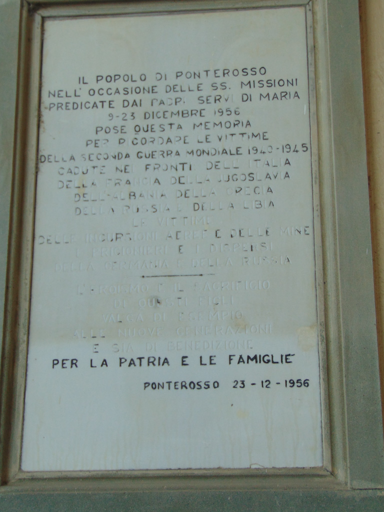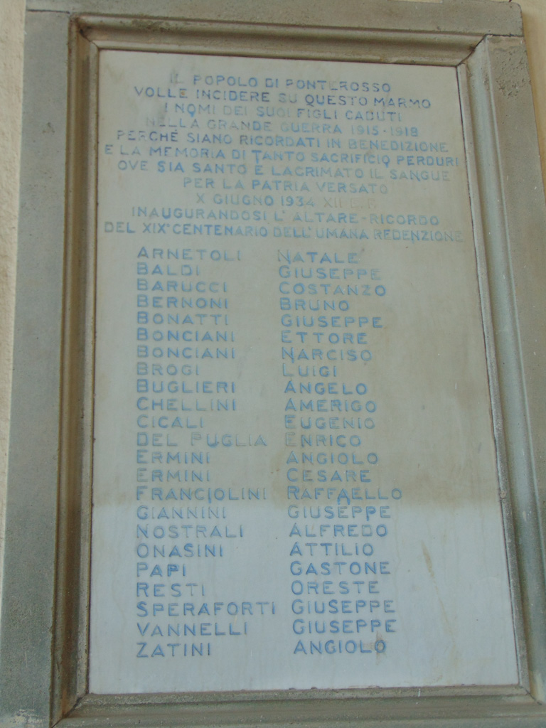Il popolo di Ponterosso vuole incidere su questo marmo i nomi dei suoi figli caduti nella grande guerra 1915-1918 perché siano ricordati in benedizione e la memoria di tanto sacrificio perduri ove sia santo e lacrimato il sangue per la patria versato X giugno 1934 XII e.r.