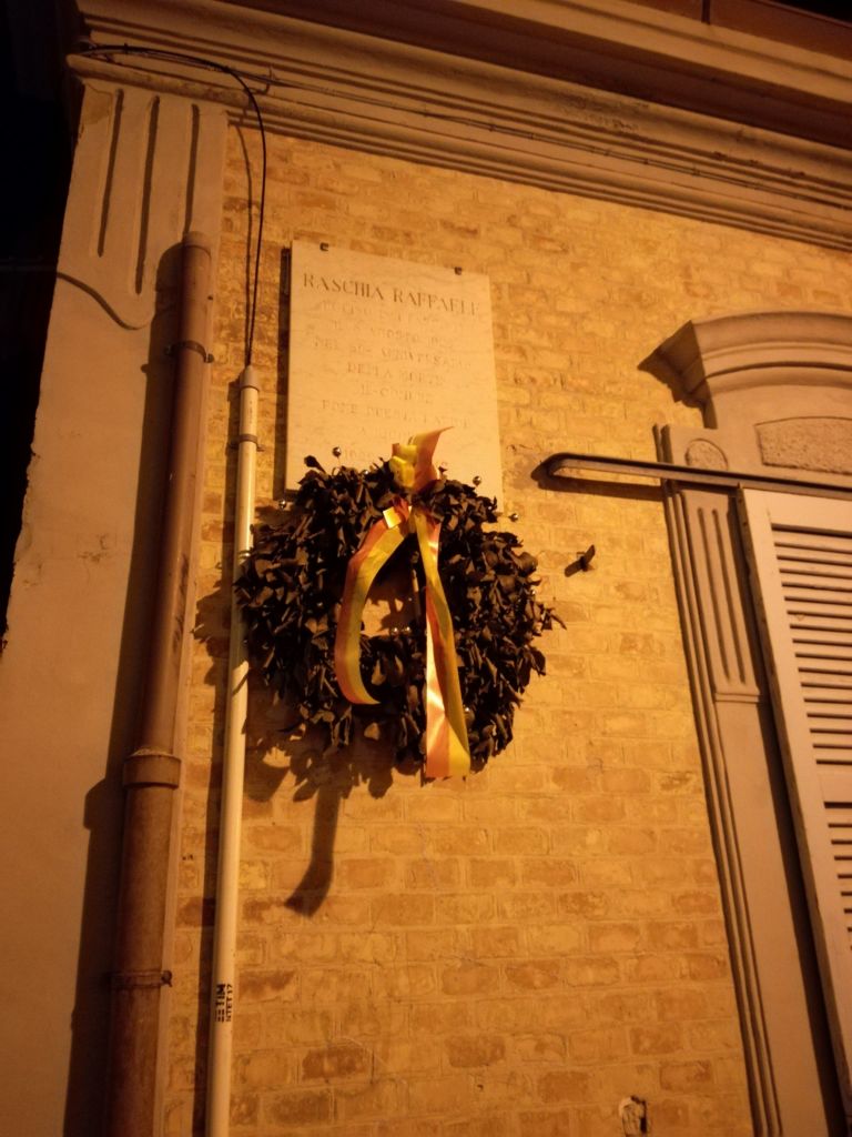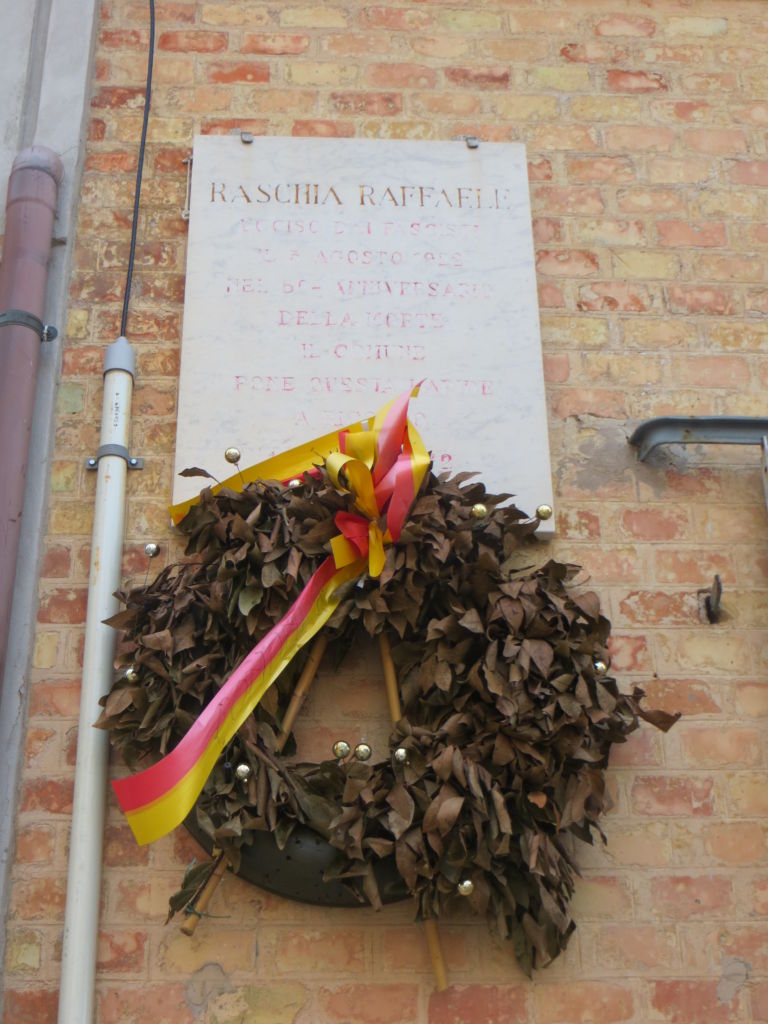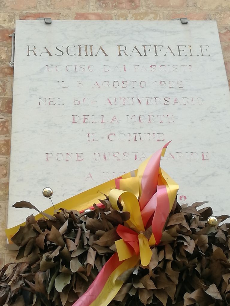 Il 5 agosto 1922 Raffaele fu freddato da una squadraccia fascista proveniente da Perugia, in cerca del fratello di lui Enrico. Alla richiesta dei documenti, bastò il cognome per condannarlo a una morte barbara e immediata. Il Comune di Ancona appose la lastra commemorativa in occasione del cinquantesimo anniversario dell'esecuzione, nel luogo in cui avvenne. La memoria di questa pietra viene raccontata da Sergio Santarello, Presidente del Collegio Revisore dei Conti della Società di Mutuo Soccorso 'Pace e Unione' di Pietralacroce, all'interno del libretto stampato per il centenario 1912-2012 del Circolo.