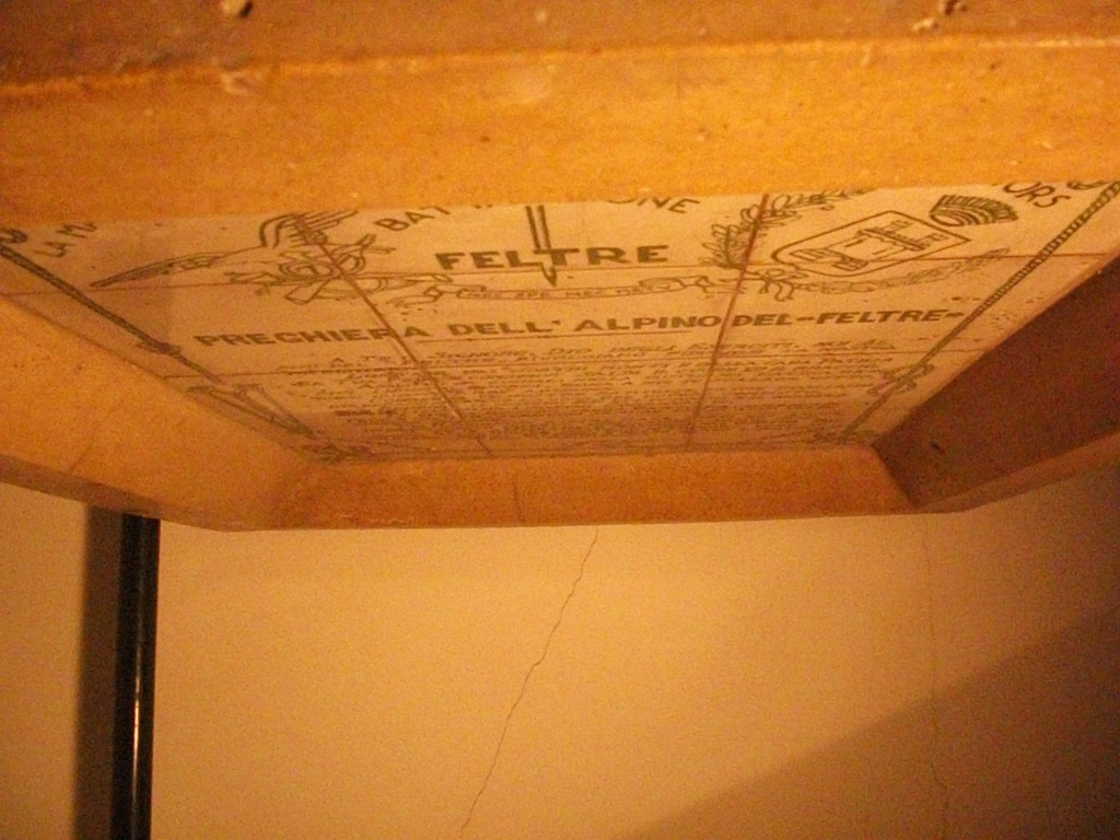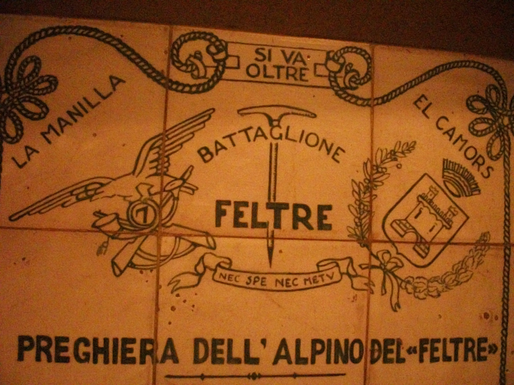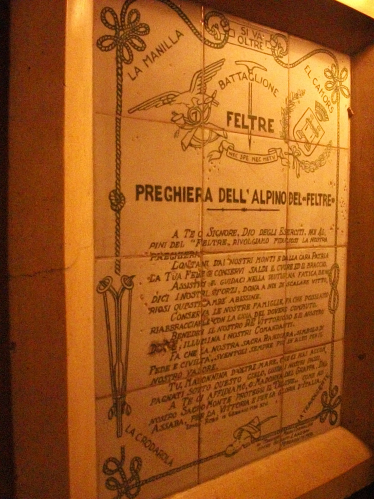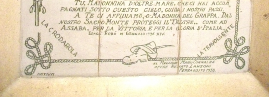 Lastra in ceramica realizzata da Renato Lanzoni e donata il 15 agosto 1938 al Maggiore Mario Cornalba (nato nel 1893), Aiutante maggiore del 7° Reggimento Alpini in Africa Orientale nel 1935-36 e, fino al 1940, comandante del Battaglione Feltre.