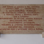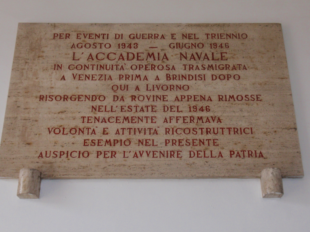 - Dopo tre anni di assenza dalla sua sede, l'Accademia Navale rientrava a Livorno riprendendo possesso degli edifici gravemente danneggiati sia dagli eventi bellici che da quelli derivanti dall'occupazione delle truppe tedesche, prima, e di quelle inglesi, poi; per tale motivo, il giorno di Santa Barbara, 4 dicembre del 1946, fu murata e inaugurata la pietra in argomento.