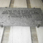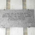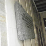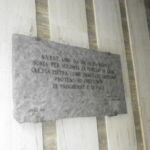 - La lastra di grandi dimensioni è realizzata in pietra, con superfice non levigata; accoglie un testo con lettere in bronzo infisse.
