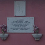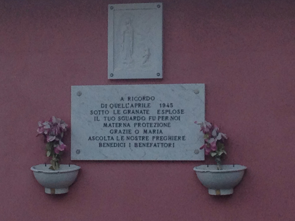 Piccola lastra rettangolare di ringraziamento a Maria per la protezione ricevuta contro le bombe della seconda guerra mondiale. Sopra la lastra si trova l’immagine della Madonna e sotto due vasi con fiori.