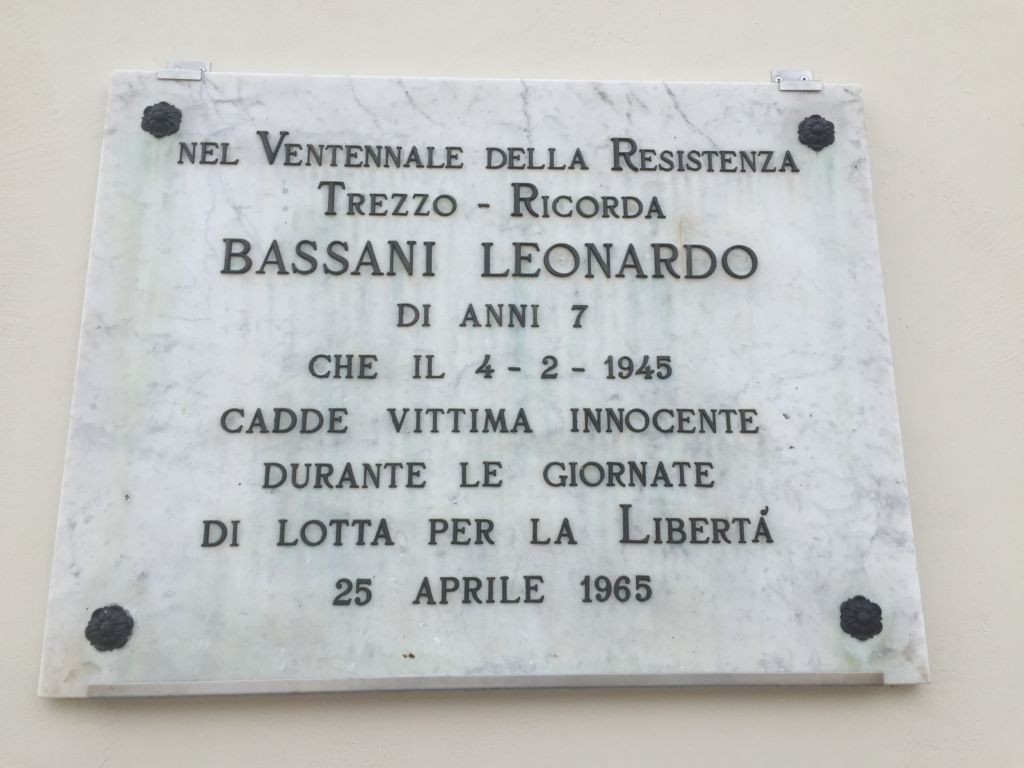 - Lastra dedicata alla memoria di Leonardo Bassani, morto tragicamente a soli sette anni in una fredda domenica di febbraio del 1945. Cadeva la neve a Trezzo e Leonardo si stava recando in chiesa con il compagno di scuola Tino Barelli; il bambino si fermò lungo il tragitto per entrare nel vespasiano, collocato dove ora sorge la scuola professionale. Appena uscì il bambino si trovò coinvolto in una sparatoria che lo uccise. Non si sa chi sparò, ma si sa che durante quell’inverno molto freddo i cittadini si procuravano la legna per il camino tagliando gli alberi tra Piazza Crivelli e la scuola e la brigata nera “Aldo Resega”, che prestava servizio di ordine pubblico sul territorio, era solita richiamare al divieto di procurarsi la legna sparando dei colpi di avvertimento.