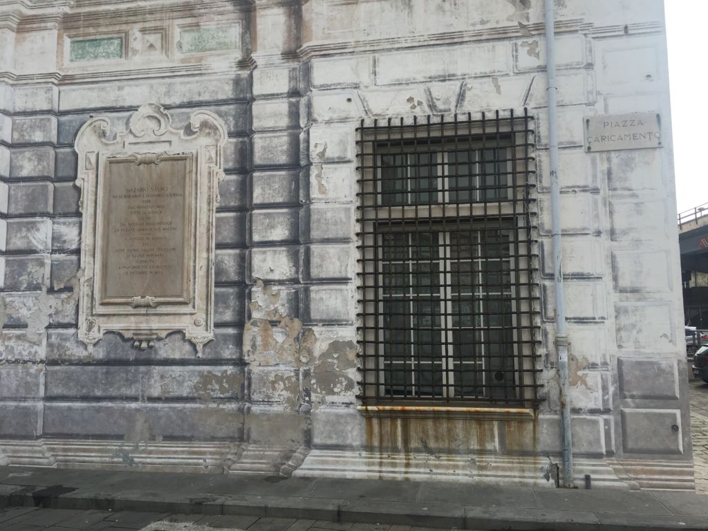 Sulla facciata di Palazzo San Giorgio, lato piazza Caricamento, è posta una lastra commemorativa, dedicata a Nazario Sauro. Il testo è sovrastante ad un fondo di color arancio sbiancato, tendente al marrone e circondato da una cornice decorata dipinta di colore grigio, in varie tonalità.