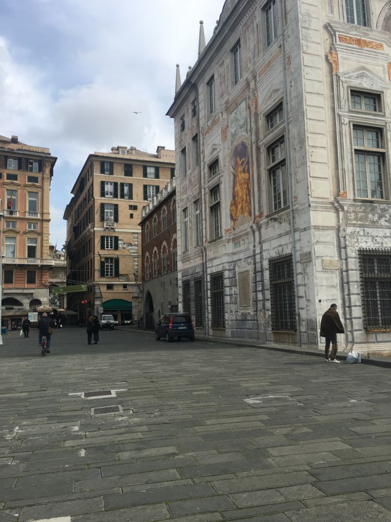 Le decorazioni della facciata risalgono al 1590 ad opera di Andrea Semino (1525-1594). Tali affreschi furono distrutti dalla salsedine nel corso di un quindicennio. Nel 1606 si pensò alla loro sostituzione elaborata da Lazzaro Tavarone (1556-1641). A partire dal 1911 vennero eseguiti lavori di ristrutturazione architettonica sotto la direzione del D’Andrade, il quale affidò a Ludovico Pogliaghi (1857-1950) il compito di rifare la decorazione in modo da riprendere l’impaginazione architettonica e l’iconografia secentesca. Gli affreschi vennero eseguiti dal pittore Ferdinando Bialetti. Grandi lavori di restauro furono eseguiti dal 1987 al 1991,  in occasione delle Celebrazioni colombiane. Cfr passionarte.wordpress.com.