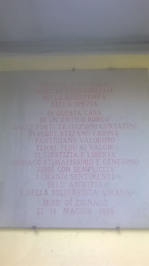 - La lastra ricorda la casa natale del Partigiano Stefano Farina che aderì alle Brigate Giustizia e Libertà e, in seguito, fu anche sindaco stimato del comune di Zignago.