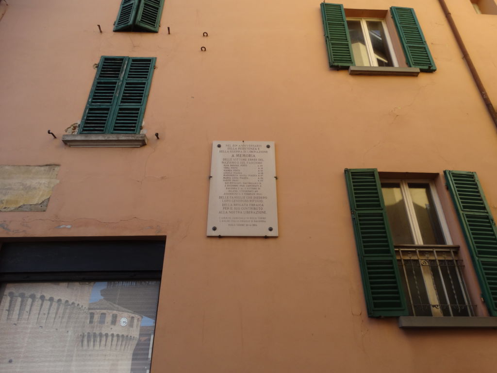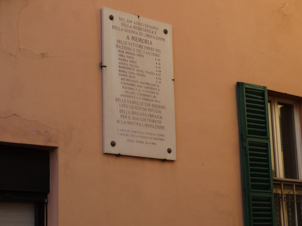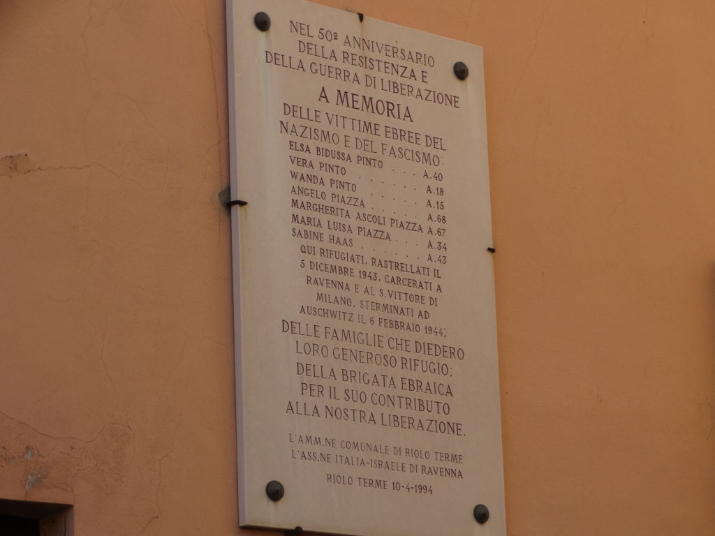 Lastra  posizionata in via Garibaldi nel centro di Riolo Terme a ricordo degli ebrei vittime del nazifascismo, delle famiglie che diedero loro aiuto, del contributo della Brigata ebraica alla Liberazione del paese di Riolo.