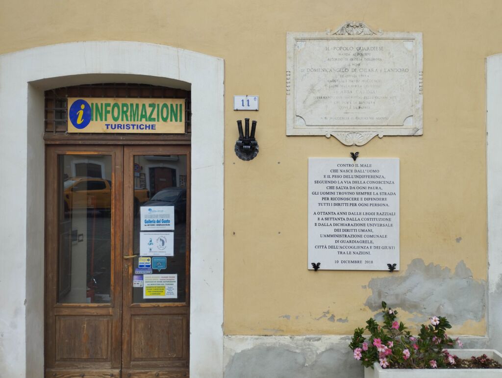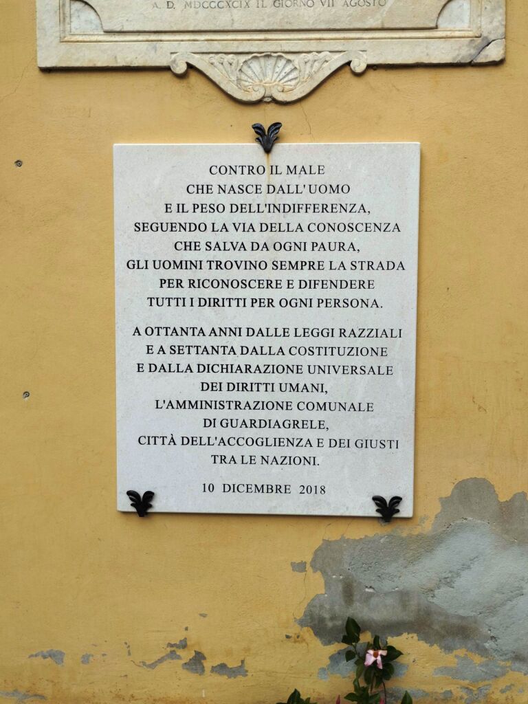 Lastra posta dall’Amministrazione comunale per ricordare sia l’accoglienza della città verso gli ebrei durante il periodo delle leggi razziali fasciste sia i guardiesi riconosciuti “Giusti tra le Nazioni”.