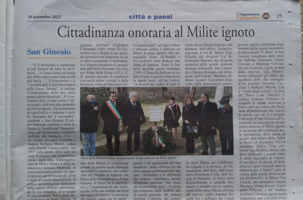 - La Municipalità di San Ginesio, in occasione del Centenario della traslazione nel sacello dell'Altare della Patria, con deliberazione del Consiglio Comunale n. 26 del 29 maggio 2021, conferisce al