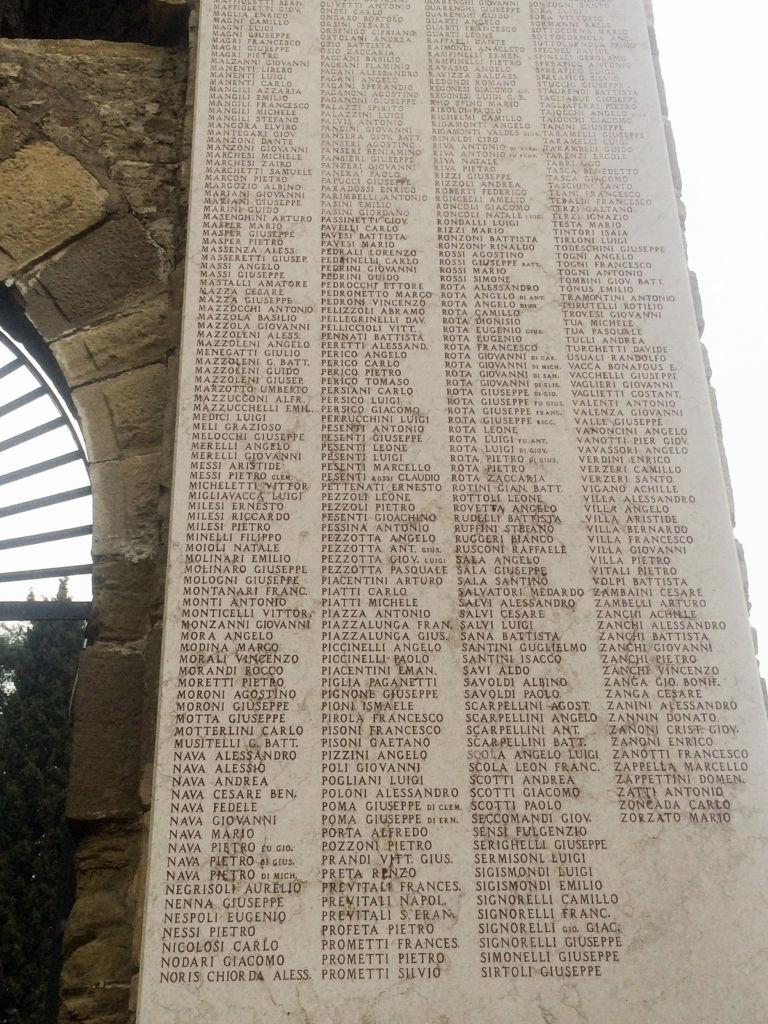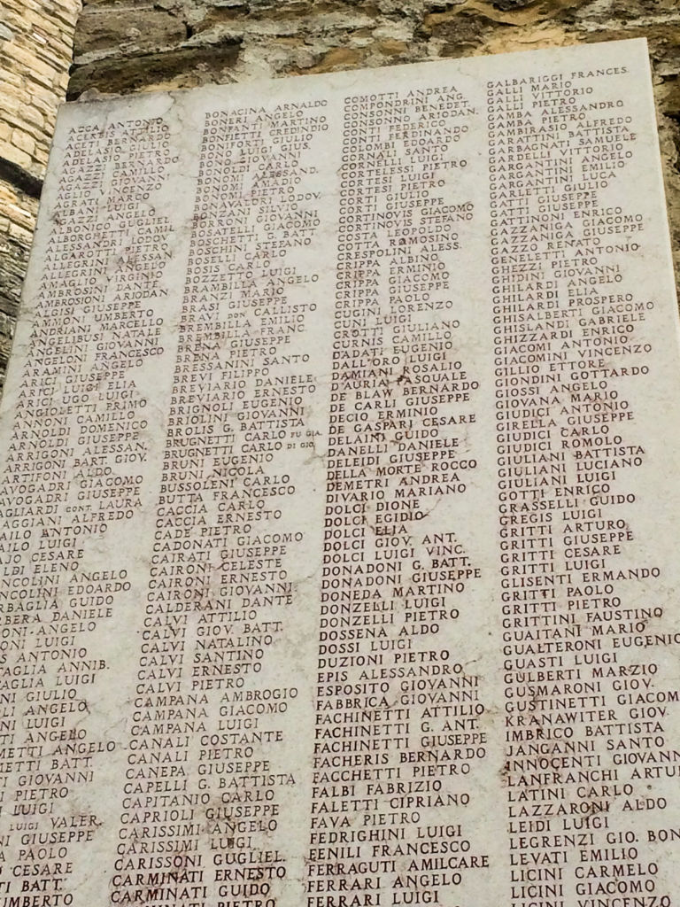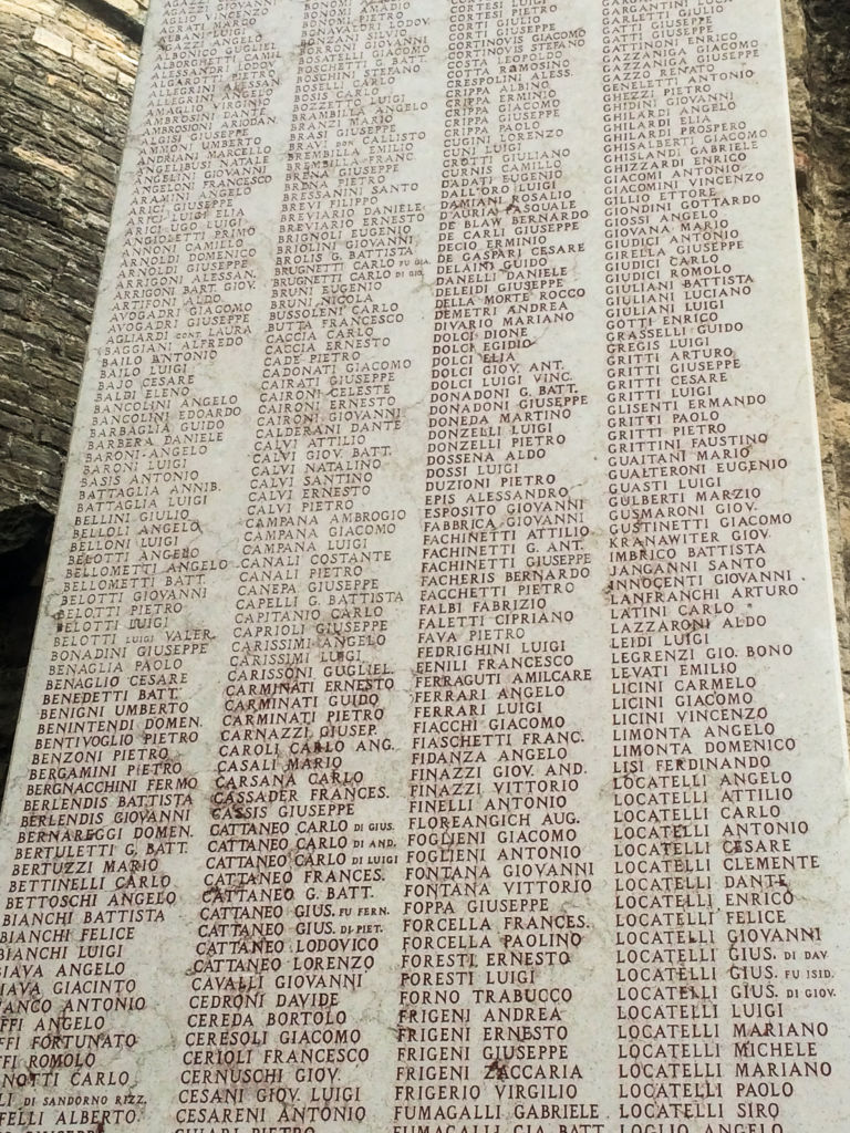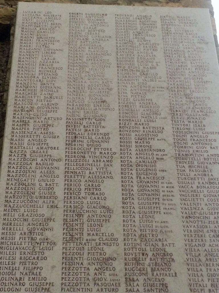 Lastre di sinistra:LAFRANCHI ARTURO,LATINI CARLO,LEIDI LUIGI,LICINI CARMELO,LICINI GIACOMO,LICINI VINCENZO,LOCATELLI ANTONIO,LUGARINI LEO,LUSSANA GIUSEPPE,LUZZANA ANGELO,MAFFIOLETTI BERANRDO,MAFFIOLETTI LUCA,MAGLIA ENRICO.MAGNI LUIGI,MAGNI GIUSEPPE,MAGNI CAMILLO,MAGRI PIETRO.MAGRI FRANCESCO,MAGRI GIUSEPPE,MANENTI LIBERO,MANENTI LUIGI,MANGILI AZZARIA,MANGILI FRANCESCO,MANGILI STEFANO,MANGOLA ELVINO,MANZONI ALESSANDRO,MANZONI DANTE,MARCHESI MIHELE,,MARCHESI ZAIRO,MARCHETTI Samuele,MARCHETTI GIOVANNI,MARCON PIETRO,MASPER ANGELO,MASPER MARIO,MASPER PIETRO,MASSI ANGELO,MASSI DAVIDE,MAZZA GIUSEPPE,MAZZA CESARE,MAZZOCCHI ANTONIO,MAZZOLEN8I ANTONIO,MAZZOLENUI ALESSANDRO,MAZZOLENI ANGELO,MELOCCHI DAVIDE,MELOCCHI PIETRO,MESSI ARISTIDE,MESSI PIETRO,MILESI RICCARDO,MILESI DAVIDER,MOIOLI NATALE,MOLINARI EMILIO,MONTI ANTONIO,MORANDI DAVUIDE,MORETTI PIETRO,MORONI AGOSTINO,MOTTA GIUSEPPE,MUSITELLI GIOVANNI,NAVA ALESSANDRO,NAVA CESARE,NAVA PIETRO,NAVA PIETRO,NEGRI ADOLFO,NEGRI GUIDO,NEGRI,ORAZIONENNA GIUSEPPE,NESPOLI EUGENIO,NESSI PIETRO,NICOLOSI CARLO,NODARI GIACOMO,OBERTI GUGLIELMO,OFFREDI GIACOMO,OLIVETTI PIETRO,PAGANI ALESSANDRO,PAGANI LUDOVICO,PAGANI SPERANDIO,PAGANONI AGOSTINO,PAGANONI GIUSEPPE,PALAZZI SPIRITO,PALAZZINI LUIGI,PANDINI GIOOVANNI,PANSERI AGOSTINO,PANSERI BENIAMINO,PANZE5RI GIOVANNI,PANERAI PAOLO,PAPUCCI GIUSEPPE,PASINETTI GIOVANNI,PEDRINI GIOVANNI,PEDRINI GUIDO,PEDRINI PIETRO,PEDRONI VINCENZO,PERICO ANGELO,’PERICO CARLO,PERSIANI CARLO,PERSIANI TOMASO,PERSICO LUIGI,PERICO LUIGI,PERICO GIOVANNO,PESWENTI LEONE,PESENTI LUIGI,PESENTI Davide,PESENTI MARCELLO,PEZZOTTA ANGELO,PEZZOTTA,DAVIDE,PEZZOTTA GIOVANNI,PIACENTINI ARTUTRO,PIAZZA ANTONIO,PIAZZALUNGA FRANCO,PIAZZALUNGA GIUSEPPE,PIACENTINI DAVUIDE, PIACENTINI LUIGI,PIGLIA PAGANETTI,PIGNONE GIUSEPPE,PIROLA DAVIDE,PIROLA STEFANO,PIZZINI ANGELO,POLI GIOVANNI,POMA GIUSEPPE,PRANDI VITTORIO,PREVITALI FRANCESCO,PREVITALI NAPOLEONE,PROFETA PIETRO,PROMETTI FRANCESWCO,PROMETTI SILVIO,PROMETTI PIETRO,PULCINI LORENZO,QUARENGHI LORENZO,QUARENGHI GIUSEPPE,QUARTI ANGELO,QUARTI LEONE,RAFFAELE DANTE,RAIMONDI RICCARDO,RAVASIO ANGELO,RHO SPINO,RIBOLDI MARCO,REGONESI GIACOMO,RIGAMONTI ANGELO,RIGAMONTI ANGELO,RIVA AANTONIO,RIVA STEFANO,RIVA NATALE,RIVA PIETRO,RIZZI GIUSEPPE,ROBERTI FEDERICO,RIZZOLI ANDREA,RONCELLLI AMELIO,RONCOLI,GIAOCMO,RONCOLI NATALE,ROSSI MARIO,ROSSI SIMONE,ROTA ALESSSANDRO,ROTA ANGELO,ROTA CAMILLO,ROTA DIONISIO,RO0TA EUGENIO,ROTA FRANCESCO,ROTA GIOVANNI,ROTA GIOVANNI,ROTA GIUSEPPE,ROTA LEONE,ROTA LUIGI,ROTA PEITRO,ROTA ZACCARIA,ROTINI BATTAGLIA,RUDELI BATTISTA,ROVETTA ANGELO,SALA ANGELO,SALA GIUSEPPE,SALA ANTINO,,SALVATORI MEDARDO,SALVI ALESSANDRO,SALVI GIUSEPPE,SALVI CESARE,SALVI PIETRO,SANTINI ISACCO,SANTINI GUGLIEMO,SAVI ALDO,SAVOLDI ALBINO,SAVOLDI PAOLO,SCARPELLINI AGOSTINO,SCARPELLINI BATTAGLIA,SCOLA ANGELO,SCOTTI Andrea,SCOTTI GIACOMO,SCOTTI PAOLO,SENSI FULGENZIO,SERIGHELLI GIUSEPPE,SERMINSOL LUIGI,SIGISMONDI LUIGI,SIGNORELLI CAMILLO,SIGNORELLI FRANCESCO,SIMONELLIN GIUSEPPE,SIRTOLI GIUSEPPE,SIRTOLI MARCO,SONGINI LORENZO,SORA LUIGI,SORA VITTORIO,SORMANDI ADELE,SOTTOCORNOLA ANGELO,SPECHEL DAVIDE,SPREAFICO ANTONIO,SPREAFICO LUIGI,SPREAFICO SILVIO,STUCCHI GIUSEPPE,TAGLIABUE GIUSEPPE,TAGLIAFERRI PIETRO,TAIOCCHI ANGELO,TAIOCCHI GIACOMO ,TANINI GIUSEPPE,TARAMELLI GIUSEPPE,TRAMELLI GUIDO,TARENZI ERCOLE,TARRIM UGO,TASCA BENEDETTO,TASCA GIACOMO,TASCHINI SANTO,TERZI IGNAZIO,TEBALDI FRAANCESCO,TERZI IGNAZIO,TESTA MARIO,TINTORIO ISAIA,TROVESI DAVIDE,TUA MARIO,TUA PASQUALE,TULLI ANDREA,TURCHELLI DAVIDE,USUALI RANDOLFO,VACCA BONAFOUS,VAGLIETTI LORENZO,VALENTI ANTONIO,VALLE GIUSEPPE,VALENZA GIOVANNI,VERDINI ENRICO,VERZERI CAMILLO,VIGANO ACHILLE,VILLA ALESSANDRO,VILLA ANGELO,VILLA ARISTIDE,VILLA BERNARDO,VILLLA FRANCESCO,VILLAS PIETRO,VITALI PIETRO,VOLPI BATTISTA,ZAMBAINI CESARE,ZAMBELLI ARTURO,ZANCHI PIETRO,ZANCHI VINCENZO,ZANCHI BATTISTA,ZANCHI ACHILLE,ZANGA CESARE,ZANNIN DONATO,ZANONI CRISTOFERO,ZANONI ENRICO,ZANOTTI FRANCESCO,ZAPPELLA MARCELLO,ZATTI ANTONIO,ZONCADA CARLO,ZORZATO MARIO