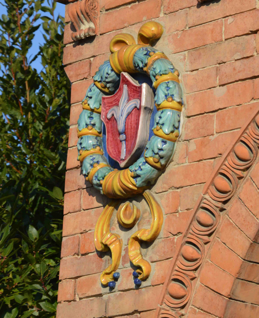 - Nella parte superiore della cappella sono riconoscibili i simboli di Trento e Trieste, incorniciati da ghirlande floreali in ceramica. E' presente anche una croce. Un elmo della seconda guerra mondiale è stato adatto a lampada votiva. In bassorilievo sono raffigurati, all'interno della cappella, Gesù in braccio alla Madonna. Sulle due lastre commemorative sono poste altrettante stelle.